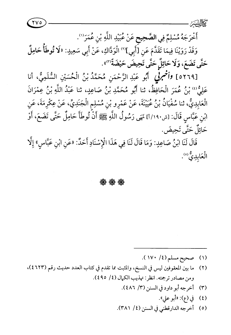 [5269] وأخبرني أَبُو عَبْدِ الرَّحْمَنِ مُحَمَّدُ بْنُ الْحُسَيْنِ السُّلَمِيُّ، أنا عَلِيُّ (¬4) بْنُ عُمَرَ الْحَافِظُ، ثنا أَبُو مُحَمَّدِ بْنُ صَاعِدٍ، ثنا عَبْدُ اللَّهِ بْنُ عِمْرَانَ الْعَابِدِيُّ، ثنا سُفْيَانُ بْنُ عُيَيْنَةَ، عَنْ عَمْرِو بْنِ مُسْلِمٍ الْجَنَدِيِّ، عَنْ عِكْرِمَةَ، عَنِ ابْنِ عَبَّاسٍ قَالَ: نَهَى رَسُولُ اللَّهِ - صلى الله عليه وسلم - أَنْ تُوطَأَ حَامِلٌ حَتَّى تَضَعَ، أَوْ حَائِلٌ حَتَّى تَحِيضَ.