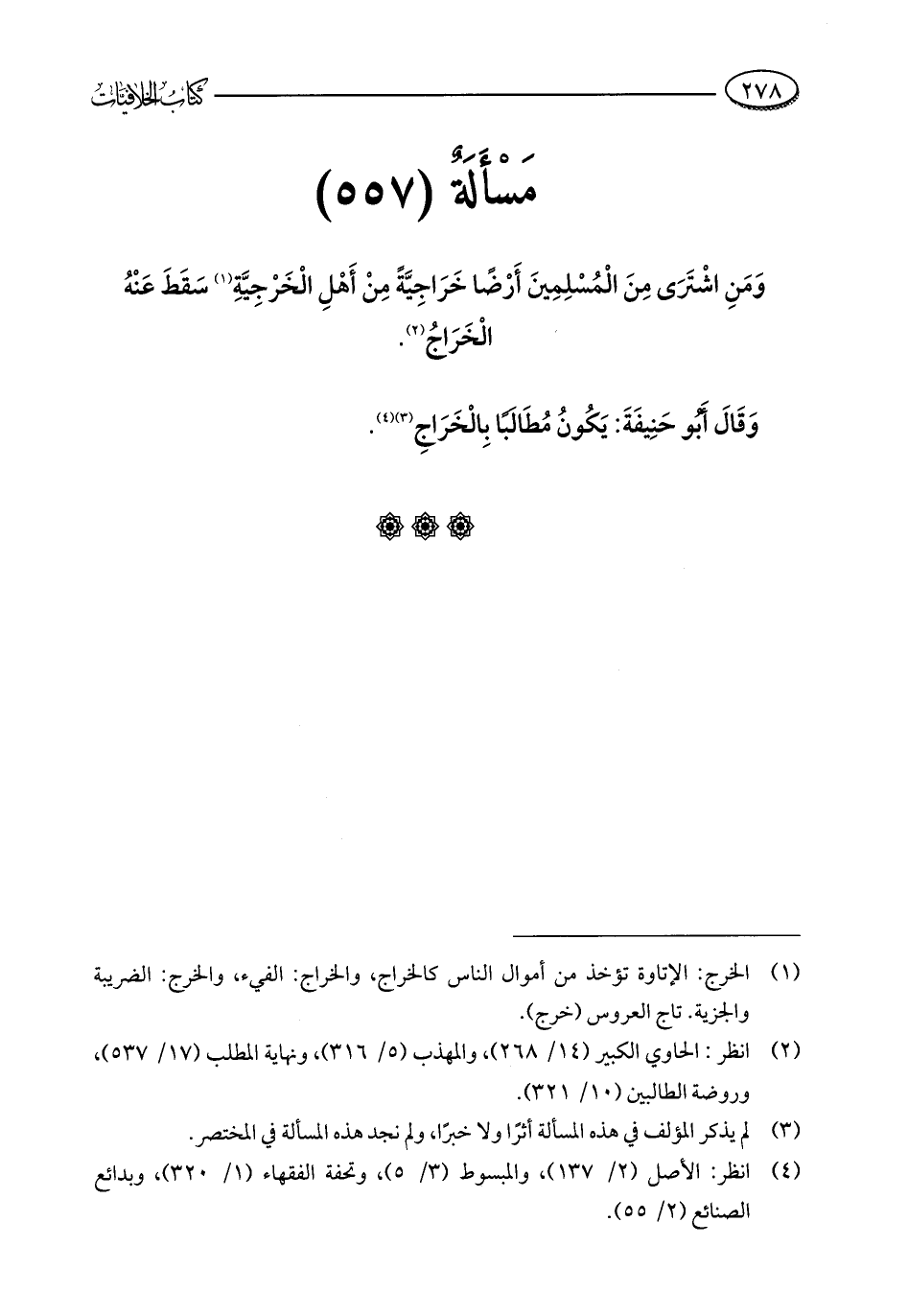 مَسْأَلَةٌ (557): وَمَنِ اشْتَرَى مِنَ الْمُسْلِمِينَ أَرْضًا خَرَاجِيَّةً مِنْ أَهْلِ الْخَرْجِيَّةِ (¬1) سَقَطَ عَنْهُ الْخَرَاجُ (¬2).