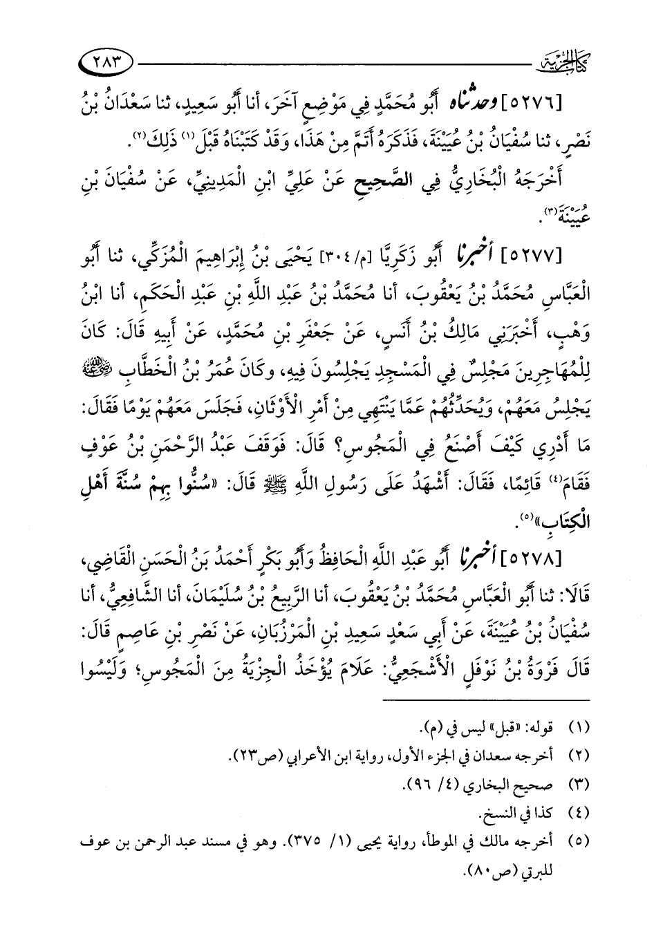 [5276] وحدثناه أَبُو مُحَمَّدٍ فِي مَوْضِعٍ آخَرَ، أنا أَبُو سَعِيدٍ، ثنا سعْدَانُ بْنُ نَصْرٍ، ثنا سُفْيَانُ بْنُ عُيَيْنَةَ، فَذَكَرَهُ أَتَمَّ مِنْ هَذَا، وَقَدْ كَتَبْنَاهُ قَبْلَ (¬1) ذَلِكَ (¬2).