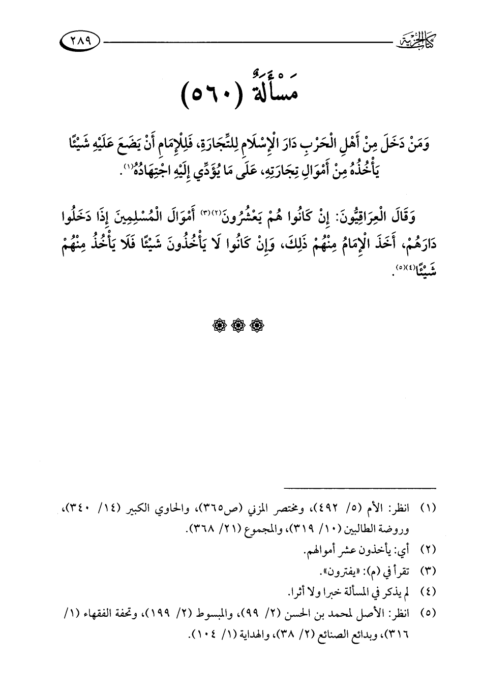 مَسْأَلَةٌ (560): وَمَنْ دَخَلَ مِنْ أَهْلِ الْحَرْبِ دَارَ الْإِسْلَامِ لِلتِّجَارَةِ، فَلِلْإِمَامِ أَنْ يَضَعَ عَلَيْهِ شَيْئًا يَأْخُذُهُ مِنْ أَمْوَالِ تِجَارَتِهِ، عَلَى مَا يُؤَدِّي إِلَيْهِ اجْتِهَادُهُ (¬1).