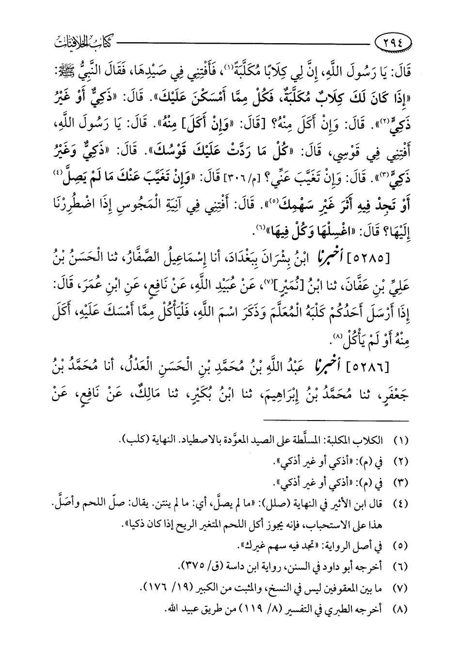 [5285] أخبرنا ابْنُ بِشْرَانَ بِبَغْدَادَ، أنا إِسْمَاعِيلُ الصَّفَّارُ، ثنا الْحَسَنُ بْنُ عَلِيِّ بْنِ عَفَّانَ، ثنا ابْنُ [نُمَيْرٍ] (¬7)، عَنْ عُبَيْدِ اللَّهِ، عَنْ نَافِعٍ، عَنِ ابْنِ عُمَرَ، قَالَ: إِذَا أَرْسَلَ أَحَدُكُمْ كَلْبَهُ الْمُعَلَّمَ وَذَكَرَ اسْمَ اللَّهِ، فَلْيَأْكُلْ مِمَّا أَمْسَكَ عَلَيْهِ، أَكَلَ مِنْهُ أَوْ لَمْ يَأْكُلْ (¬8).
