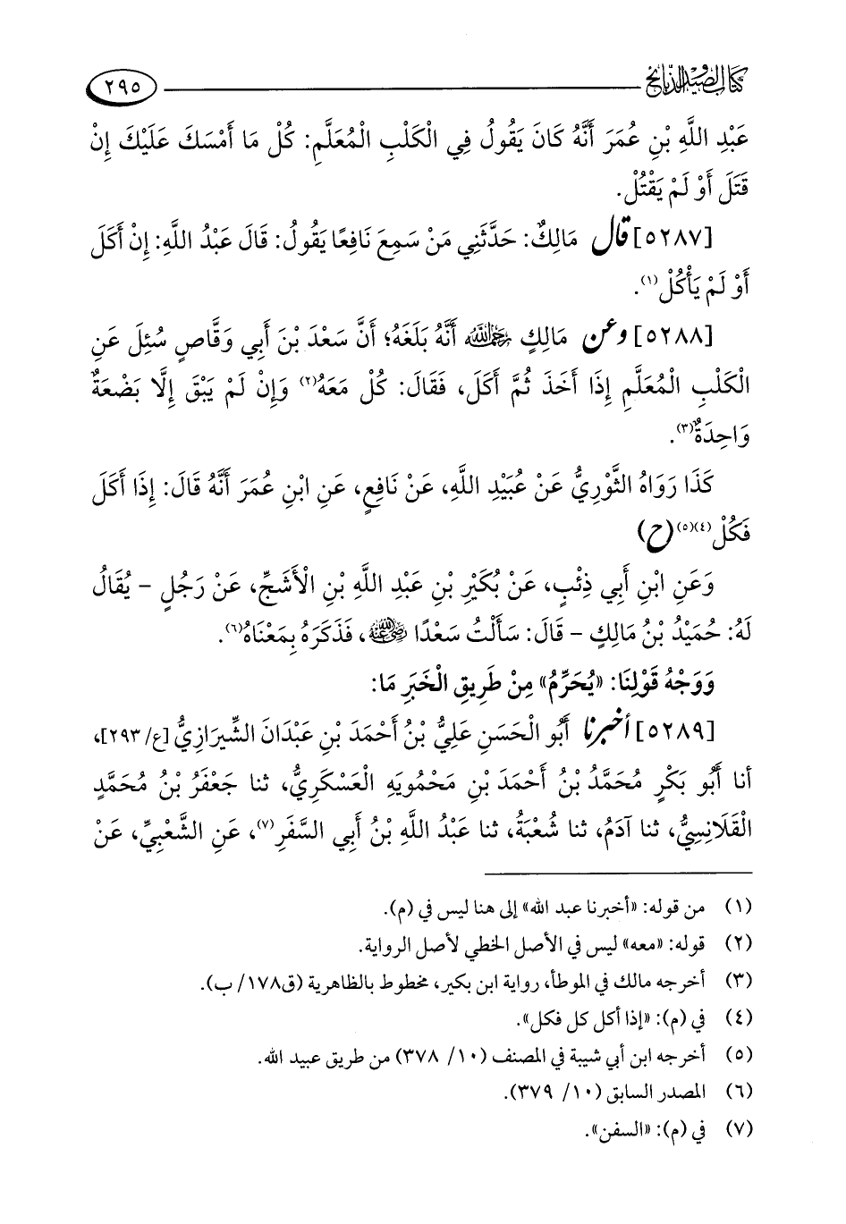 [5288] وعن مَالِكٍ - رحمه الله - أَنَّهُ بَلَغَهُ؛ أَنَّ سَعْدَ بْنَ أَبِي وَقَّاصٍ سُئِلَ عَنِ الْكَلْبِ الْمُعَلَّمِ إِذَا أَخَذَ ثُمَّ أَكَلَ، فَقَالَ: كُلْ مَعَهُ (¬2) وَإِنْ لَمْ يَبْقَ إِلَّا بَضْعَةٌ وَاحِدَةٌ (¬3).