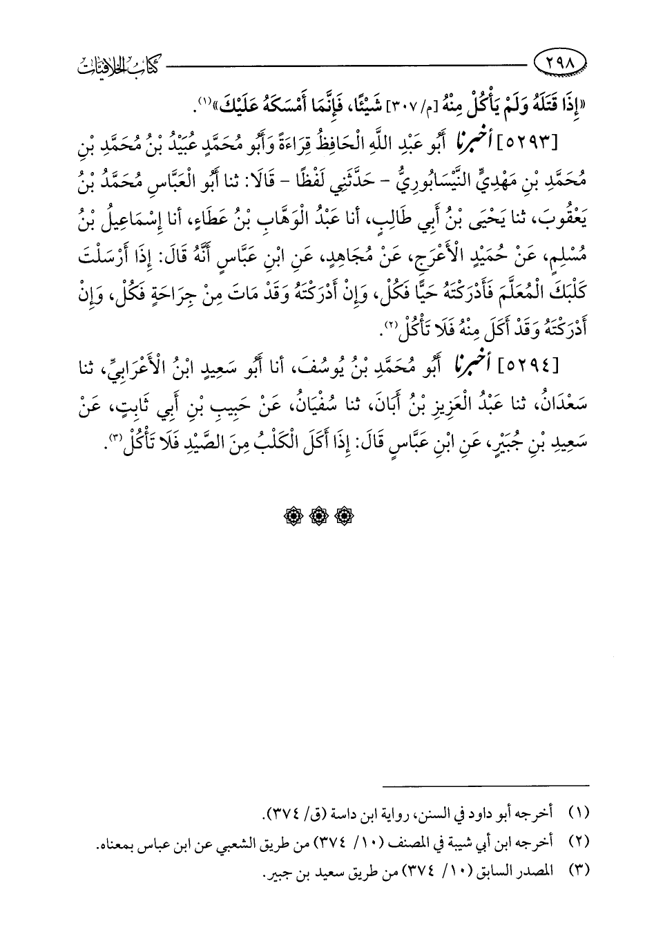 [5294] أخبرنا أَبُو مُحَمَّدِ بْنُ يُوسُفَ، أنا أَبُو سَعِيدٍ ابْنُ الْأَعْرَابِيِّ، ثنا سَعْدَانُ، ثنا عَبْدُ الْعَزِيزِ بْنُ أَبَانَ، ثنا سُفْيَانُ، عَنْ حَبِيبِ بْنِ أَبِي ثَابِتٍ، عَنْ سَعِيدِ بْنِ جُبَيْرٍ، عَنِ ابْنِ عَبَّاسٍ قَالَ: إِذَا أَكَلَ الْكَلْبُ مِنَ الصَّيْدِ فَلَا تَأْكُلْ (¬3).