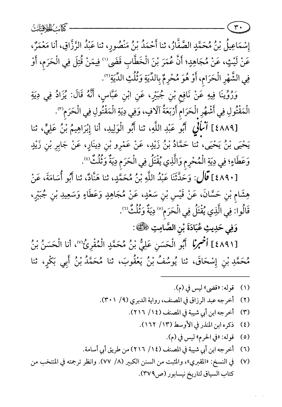 [4890] قال: وَحَدَّثَنَا عَبْدُ اللَّهِ بْنُ مُحَمَّدٍ، ثنا هَنَّادٌ، ثنا أَبُو أُسَامَةَ، عَنْ هِشَامِ بْنِ حَسَّانَ، عَنْ قَيْسِ بْنِ سَعْدٍ، عَنْ مُجَاهِدٍ وَعَطَاءٍ وَسَعِيدِ بْنِ جُبَيْرٍ، قَالُوا: فِي الَّذِي يُقْتَلُ فِي الْحَرَمِ (¬5) دِيَةٌ وَثُلُثٌ (¬6).