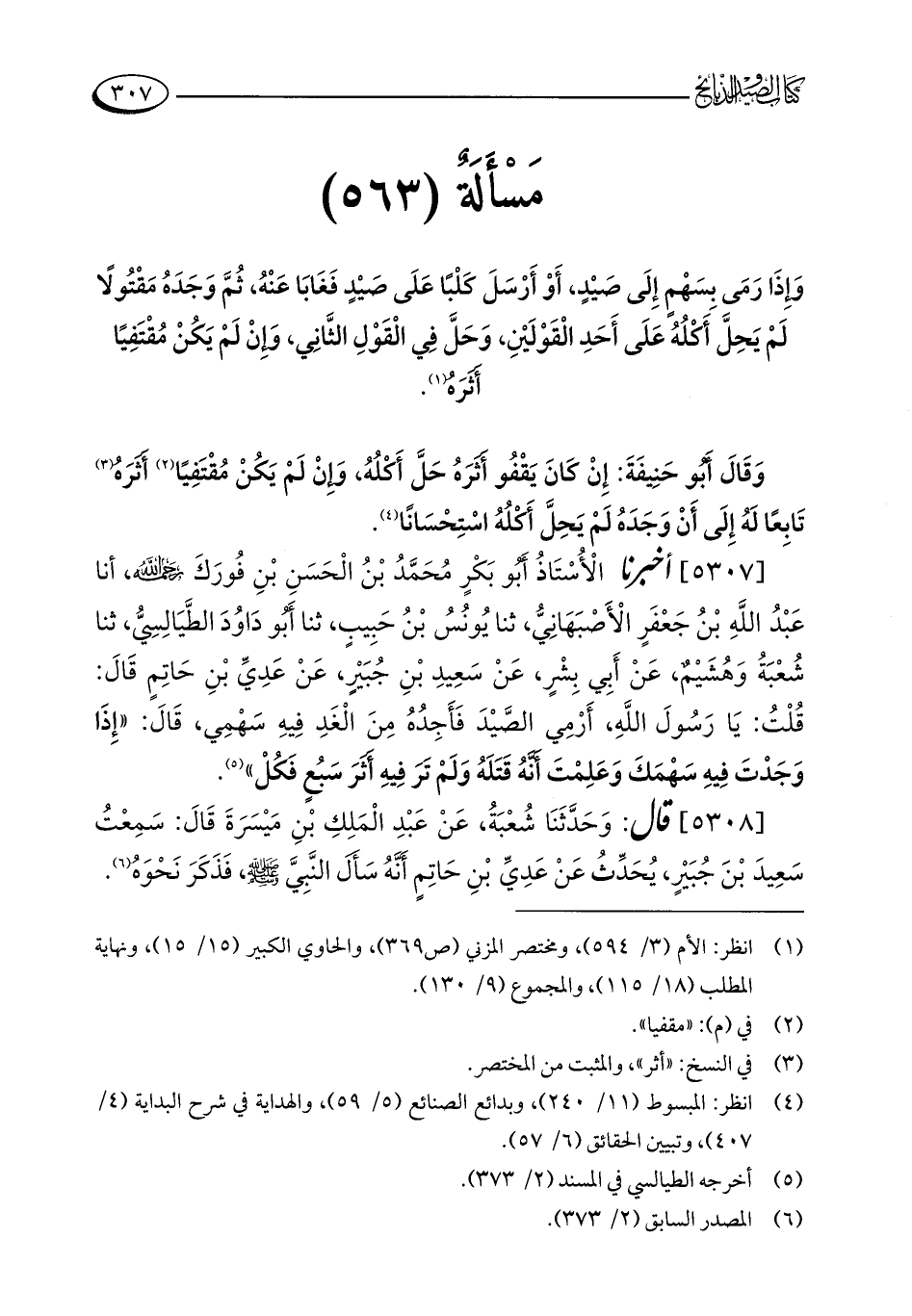 [5307] أخبرنا الْأُسْتَاذُ أَبُو بَكْرٍ مُحَمَّدُ بْنُ الْحَسَنِ بْنِ فُورَكَ - رحمه الله -، أنا عَبْدُ اللَّهِ بْنُ جَعْفَرٍ الْأَصْبَهَانِيُّ، ثنا يُونُسُ بْنُ حَبِيبٍ، ثنا أَبُو دَاوُدَ الطَّيَالِسِيُّ، ثنا شعْبَةُ وَهُشَيْمٌ، عَنْ أَبِي بِشْرٍ، عَنْ سَعِيدِ بْنِ جُبَيْرٍ، عَنْ عَدِيِّ بْنِ حَاتِمٍ قَالَ: قُلْتُ: يَا رَسُولَ اللَّهِ، أَرْمِي الصَّيْدَ فَأَجِدُهُ مِنَ الْغَدِ فِيهِ سَهْمِي، قَالَ: "إِذَا وَجَدْتَ فِيهِ سَهْمَكَ وَعَلِمْتَ أَنَّهُ قَتَلَهُ وَلَمْ تَرَ فِيهِ أَثَرَ سَبُعٍ فَكُلْ" (¬5).