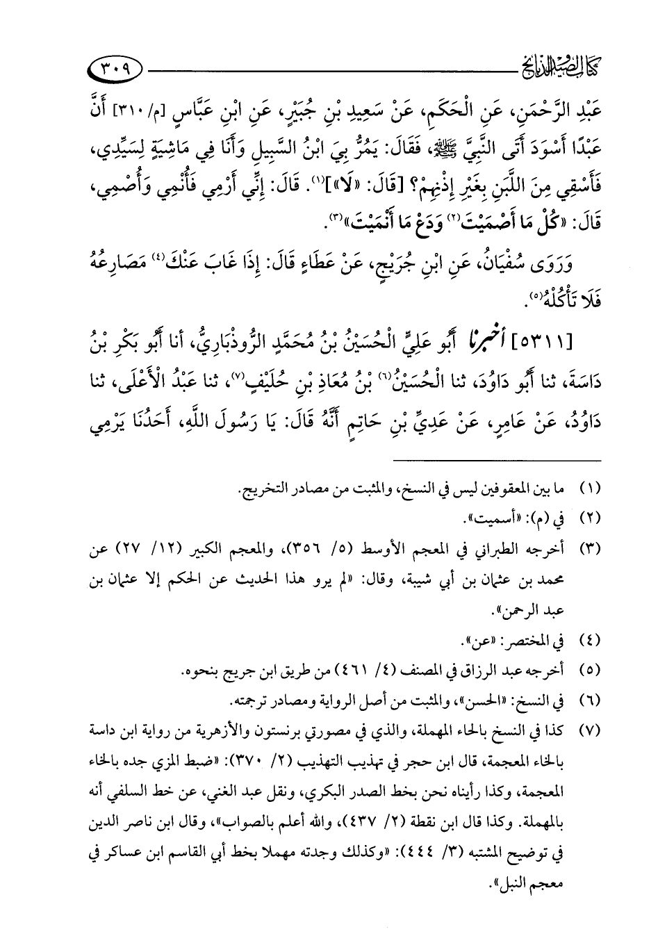 عَبْدِ الرَّحْمَنِ، عَنِ الْحَكَمِ، عَنْ سَعِيدِ بْنِ جُبَيْرٍ، عَنِ ابْنِ عَبَّاسٍ أَنَّ عَبْدًا أَسْوَدَ أَتَى النَّبِيَّ - صلى الله عليه وسلم -، فَقَالَ: يَمُرُّ بِيَ ابْنُ السَّبِيلِ وَأَنَا فِي مَاشِيَةٍ لِسَيِّدِي، فَأَسْقِي مِنَ اللَّبَنِ بِغَيْرِ إِذْنِهِمْ؟ [قَالَ: "لَا"] (¬1). قَالَ: إِنِّي أَرْمِي فَأُنْمِي وَأُصْمِي، قَالَ: "كُلْ مَا أَصْمَيْتَ (¬2) وَدَعْ مَا أَنْمَيْتَ" (¬3).