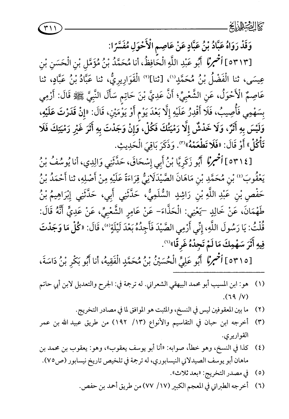 [5313] أخبرنا أَبُو عَبْدِ اللَّهِ الْحَافِظُ، أنا مُحَمَّدُ بْنُ مُؤَمَّلِ بْنِ الْحَسَنِ بْنِ عِيسَى، ثنا الْفَضْلُ بْنُ مُحَمَّدٍ (¬1)، [ثنا] (¬2) الْقَوَارِيرِيُّ، ثنا عَبَّادُ بْنُ عَبَّادٍ، ثنا عَاصِمٌ الْأَحْوَلُ، عَنِ الشَّعْبِيِّ؛ أَنَّ عَدِيَّ بْنَ حَاتِمٍ سَأَلَ النَّبِيَّ - صلى الله عليه وسلم - قَالَ: أَرْمِي بِسَهْمِي فَأُصِيبُ، فَلَا أَقْدِرُ عَلَيْهِ إِلَّا بَعْدَ يَوْمٍ أَوْ يَوْمَيْنِ، قَالَ: "إِنْ قَدَرْتَ عَلَيْهِ، وَلَيْسَ بِهِ أَثَرٌ، وَلَا خَدْشٌ إِلَّا رَمْيَتُكَ فَكُلْ، وَإِنْ وَجَدْتَ بِهِ أَثَرَ غَيْرِ رَمْيَتِكَ فَلَا تَأْكُلْ" أَوْ قَالَ: "فَلَا تَطْعَمْهُ" (¬3). وَذَكَرَ بَاقِيَ الْحَدِيثِ.