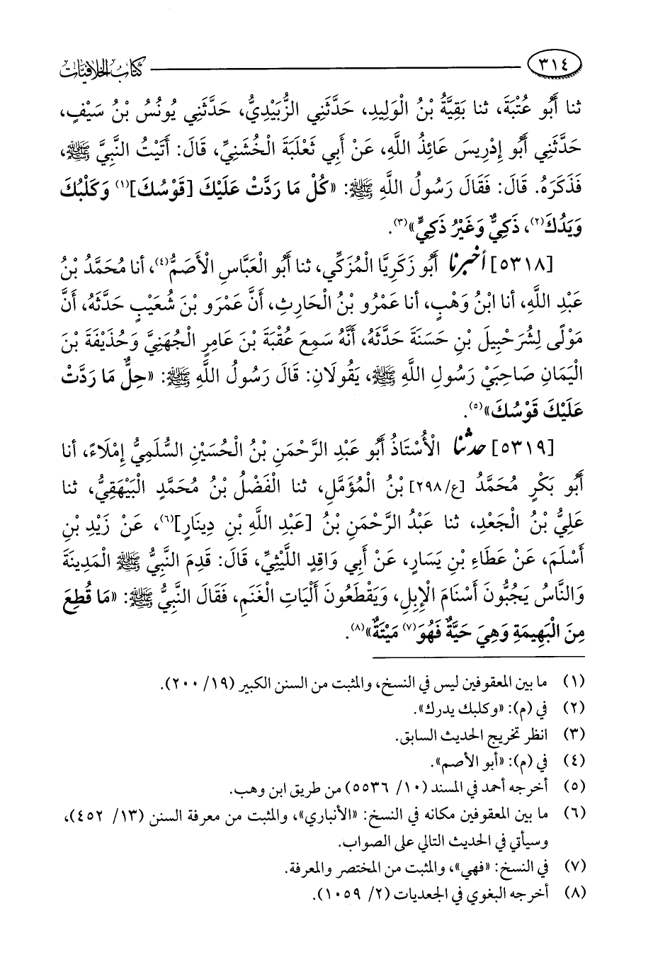 [5318] أخبرنا أَبُو زَكَرِيَّا الْمُزَكِّي، ثنا أَبُو الْعَبَّاسِ الْأَصَمُّ (¬4)، أنا مُحَمَّدُ بْنُ عَبْدِ اللَّهِ، أنا ابْنُ وَهْبٍ، أنا عَمْرُو بْنُ الْحَارِثِ، أَنَّ عَمْرَو بْنَ شُعَيْبٍ حَدَّثَهُ، أَنَّ مَوْلًى لِشُرَحْبِيلَ بْنِ حَسَنَةَ حَدَّثَهُ، أَنَّهُ سَمِعَ عُقْبَةَ بْنَ عَامِرٍ الْجُهَنِيَّ وَحُذَيْفَةَ بْنَ الْيَمَانِ صَاحِبَيْ رَسُولِ اللَّهِ - صلى الله عليه وسلم -، يَقُولَانِ: قَالَ رَسُولُ اللَّهِ - صلى الله عليه وسلم -: "حِلٌّ مَا رَدَّتْ عَلَيْكَ قَوْسُكَ" (¬5).