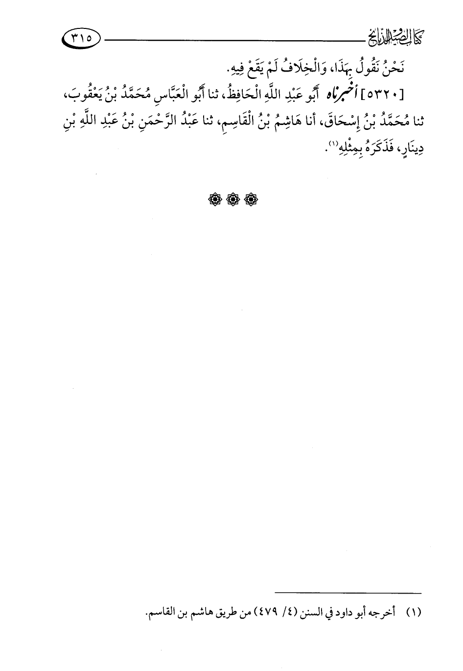 [5320] أخبرناه أَبُو عَبْدِ اللَّهِ الْحَافِظُ، ثنا أَبُو الْعَبَّاسِ مُحَمَّدُ بْنُ يَعْقُوبَ، ثنا مُحَمَّدُ بْنُ إِسْحَاقَ، أنا هَاشِمُ بْنُ الْقَاسِمِ، ثنا عَبْدُ الرَّحْمَنِ بْنُ عَبْدِ اللَّهِ بْنِ دِينَارٍ، فَذَكَرَهُ بِمِثْلِهِ (¬1).