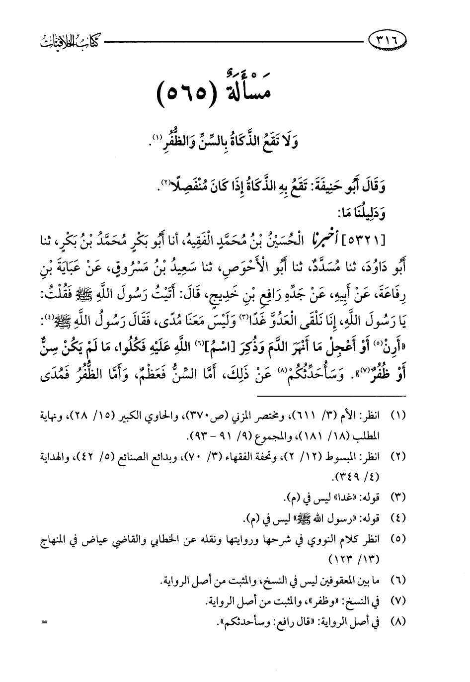 [5321] أخبرنا الْحُسَيْنُ بْنُ مُحَمَّدٍ الْفَقِيهُ، أنا أَبُو بَكْرٍ مُحَمَّدُ بْنُ بَكْرٍ، ثنا أَبُو دَاوُدَ، ثنا مُسَدَّدٌ، ثنا أَبُو الْأَحْوَص، ثنا سَعيدُ بْنُ مَسْرُوقٍ، عَنْ عَبَايَةَ بْنِ رِفَاعَةَ، عَنْ أَبِيهِ، عَنْ جَدِّهِ رَافِعِ بْنِ خَدِيجٍ، قَالَ: أَتَيْتُ رَسُولَ اللَّهِ - صلى الله عليه وسلم - فَقُلْتُ: يَا رَسُولَ اللَّهِ، إِنَا نَلْقَى الْعَدُوَّ غَدًا (¬3) وَلَيْسَ مَعَنَا مُدًى، فَقَالَ رَسُولُ اللَّهِ - صلى الله عليه وسلم - (¬4): "أَرِنْ (¬5) أَوْ أَعْجِلْ مَا أَنْهَرَ الدَّمَ وَذُكِرَ [اسْمُ] (¬6) اللَّهِ عَلَيْهِ فَكُلُوا، مَا لَمْ يَكُنْ سِنٌّ أَوْ ظُفُرٌ (¬7) ". وَسَأُحَدِّثُكُمْ (¬8) عَنْ ذَلِكَ، أَمَّا السِّنُّ فَعَظْمٌ، وَأَمَّا الظُّفُرُ فَمُدَى