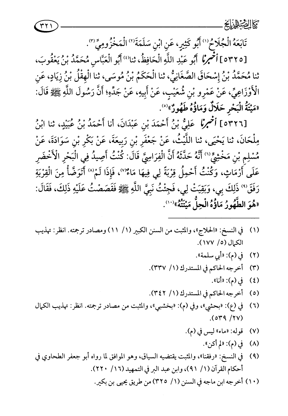 [5326] أخبرنا عَلِيُّ بْنُ أَحْمَدَ بْنِ عَبْدَانَ، أنا أَحْمَدُ بْنُ عُبَيْدٍ، ثنا ابْنُ مِلْحَانَ، ثنا يَحْيَى، ثنا اللَّيْثُ، عَنْ جَعْفَرِ بْنِ رَبِيعَةَ، عَنْ بَكْرِ بْنِ سَوَادَةَ، عَنْ مُسْلِمِ بْنِ مَخْشِيٍّ (¬6) أَنَّهُ حَدَّثَهُ أَنَّ الْفِرَاسِيَّ قَالَ: كُنْتُ أَصِيدُ فِي الْبَحْرِ الْأَخْضَرِ عَلَى أَرْمَاثٍ، وَكُنْتُ أَحْمِلُ قِرْبَةً لِي فِيهَا مَاءٌ (¬7)، فَإِذَا لَمْ (¬8) أَتَوَضَّأْ مِنَ الْقِرْبَةِ رَفَقَ (¬9) ذَلِكَ بِي، وَبَقِيَتْ لِي، فَجِئْتُ نَبِيَّ اللَّهِ - صلى الله عليه وسلم - فقَصَصْتُ عَلَيْهِ ذَلِكَ، فَقَالَ: "هُوَ الطَّهُورُ مَاؤُهُ الْحِلُّ مَيْتَتُهُ" (¬10).