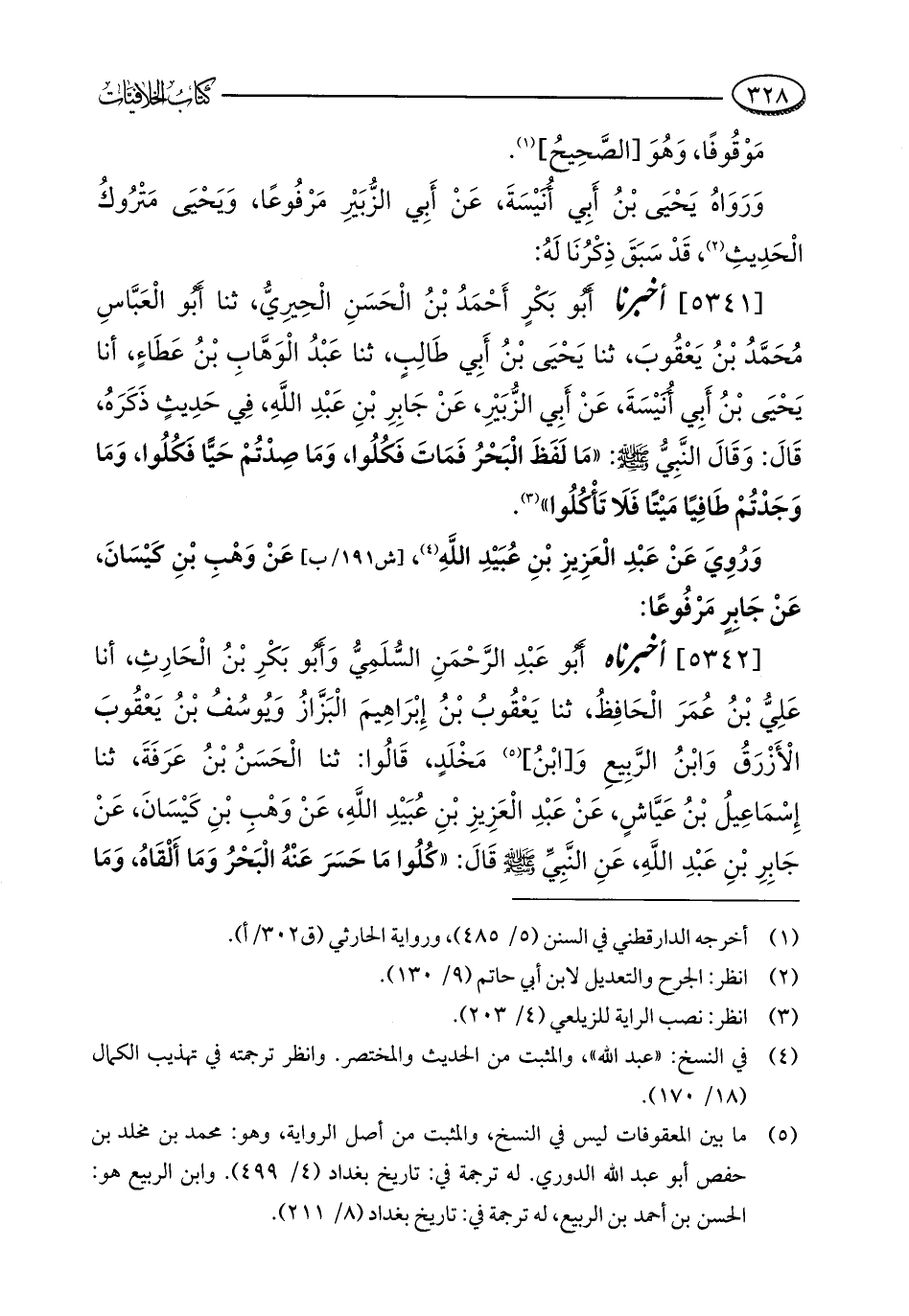 [5342] أخبرناه أَبُو عَبْدِ الرَّحْمَنِ السُّلَمِيُّ وَأَبُو بَكْرِ بْنُ الْحَارِثِ، أنا عَلِيُّ بْنُ عُمَرَ الْحَافِظُ، ثنا يَعْقُوبُ بْنُ إِبْرَاهِيمَ الْبَزَّازُ وَيُوسُفُ بْنُ يَعْقُوبَ الْأَزْرَقُ وَابْنُ الرَّبِيعِ وَ [ابْنُ] (¬5) مَخْلَدٍ، قَالُوا: ثنا الْحَسَنُ بْنُ عَرَفَةَ، ثنا إِسْمَاعِيلُ بْنُ عَيَّاشٍ، عَنْ عَبْدِ الْعَزِيزِ بْنِ عُبَيْدِ اللَّهِ، عَنْ وَهْبِ بْنِ كَيْسَانَ، عَنْ جَابِرِ بْنِ عَبْدِ اللَّهِ، عَنِ النَّبِيِّ - صلى الله عليه وسلم - قَالَ: "كُلُوا مَا حَسَرَ عَنْهُ الْبَحْرُ وَمَا أَلْقَاهُ، وَمَا