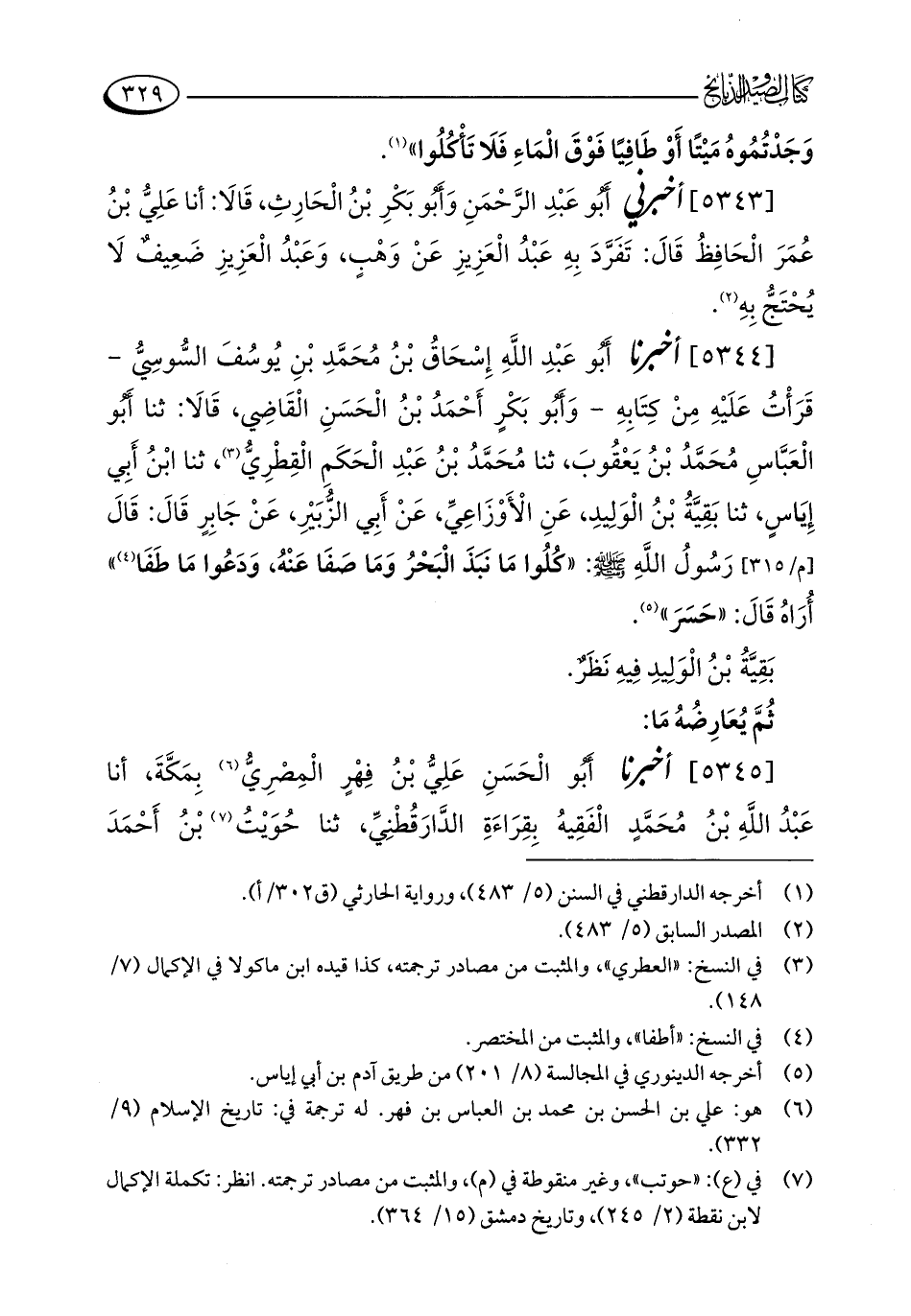 [5343] أخبرني أَبُو عَبْدِ الرَّحْمَنِ وَأَبُو بَكْرِ بْنُ الْحَارِثِ، قَالَا: أنا عَلِيُّ بْنُ عُمَرَ الْحَافِظُ قَالَ: تَفَرَّدَ بِهِ عَبْدُ الْعَزِيزِ عَنْ وَهْبٍ، وَعَبْدُ الْعَزِيزِ ضَعِيفٌ لَا يُحْتَجُّ بِهِ (¬2).