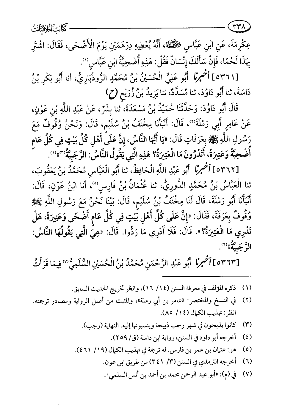 [5362] أخبرنا أَبُو عَبْدِ اللَّهِ الْحَافِظُ، ثنا أَبُو الْعَبَّاسِ مُحَمَّدُ بْنُ يَعْقُوبَ، ثنا الْعَبَّاسُ بْنُ مُحَمَّدٍ الدُّورِيُّ، ثنا عُثْمَانُ بْنُ فَارِسٍ (¬5)، أنا ابْنُ عَوْنٍ، قَالَ: أَنْبَأَنَا أَبُو رَمْلَةَ، قَالَ لَنَا مِخْنَفُ بْنُ سُلَيْمٍ، قَالَ: بَيْنَا نَحْنُ مَعَ رَسُولِ اللَّهِ - صلى الله عليه وسلم - وُقُوفٌ بِعَرَفَةَ، فَقَالَ: "إِنَّ عَلَى كُلِّ أَهْلِ بَيْتٍ فِي كُلِّ عَامٍ أَضْحًى وَعَتِيرَةً، هَلْ تَدْرِي مَا الْعَتِيرَةُ؟ ". قَالَ: فَلَا أَدْرِي مَا رَدُّوا. قَالَ: "هِيَ الَّتِي يَقُولُهَا النَّاسُ: الرَّجَبِيَّةُ" (¬6).