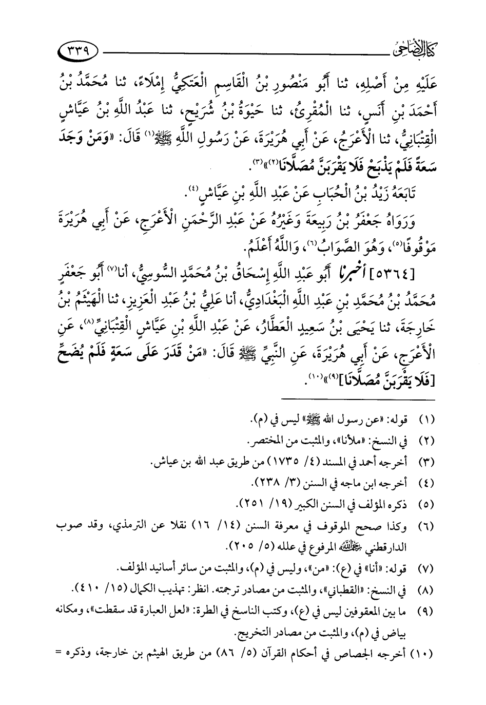 عَلَيْهِ مِنْ أَصْلِهِ، ثنا أَبُو مَنْصُورِ بْنُ الْقَاسِمِ الْعَتَكِيُّ إِمْلَاءً، ثنا مُحَمَّدُ بْنُ أَحْمَدَ بْنِ أَنَسٍ، ثنا الْمُقْرِئُ، ثنا حَيْوَةُ بْنُ شُرَيْحٍ، ثنا عَبْدُ اللَّهِ بْنُ عَيَّاشٍ الْقِتْبَانِيُّ، ثنا الْأَعْرَجُ، عَنْ أَبِي هُرَيْرَةَ، عَنْ رَسُولِ اللَّهِ - صلى الله عليه وسلم - (¬1) قَالَ: "وَمَنْ وَجَدَ سَعَةً فَلَمْ يَذْبَحْ فَلَا يَقْرَبَنَّ مُصَلَّانَا (¬2) " (¬3).