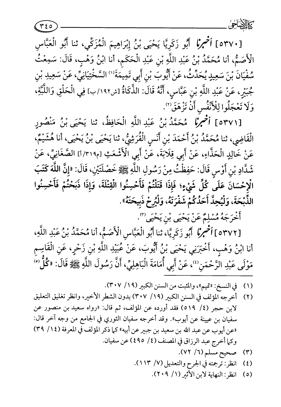 [5370] أخبرنا أَبُو زَكَرِيَّا يَحْيَى بْنُ إِبْرَاهِيمَ الْمُزَكِّي، ثنا أَبُو الْعَبَّاسِ الْأَصَمُّ، أنا مُحَمَّدُ بْنُ عَبْدِ اللَّهِ بْنِ عَبْدِ الْحَكَمِ، أنا ابْنُ وَهْبٍ، قَالَ: سَمِعْتُ سُفْيَانَ بْنَ سَعِيدٍ يُحَدِّثُ، عَنْ أَيُّوبَ بْنِ أَبِي تَمِيمَةَ (¬1) السَّخْتِيَانِيِّ، عَنْ سَعِيدِ بْنِ جُبَيْرٍ، عَنْ عَبْدِ اللَّهِ بْنِ عَبَّاسٍ، أَنَّهُ قَالَ: الذَّكَاةُ فِي الْحَلْقِ وَاللَّبَّةِ، وَلَا تَعْجَلُوا لِلْأَنْفُسِ أَنْ تَزْهَقَ (¬2).
