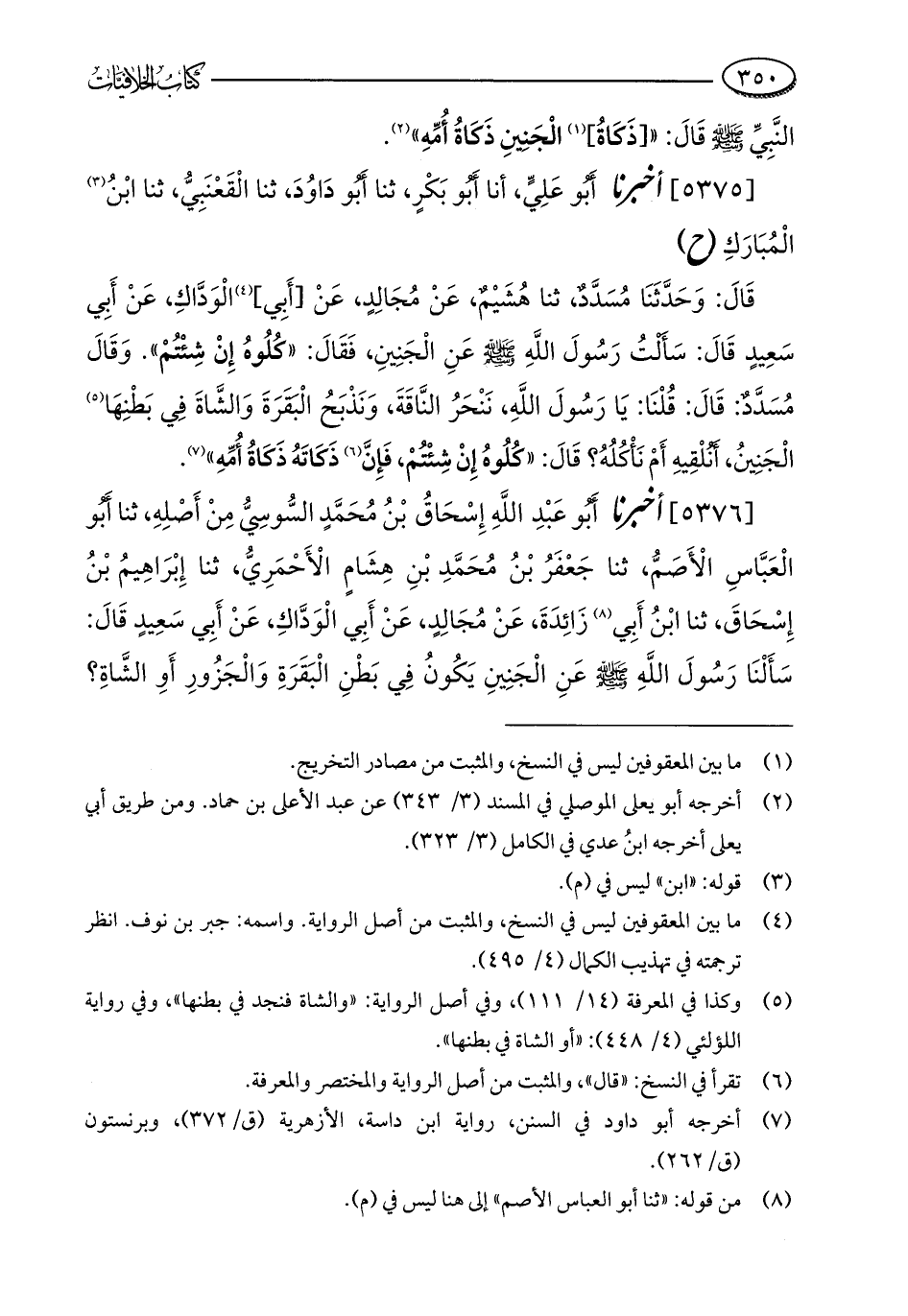 قَالَ: وَحَدَّثَنَا مُسَدَّدٌ، ثنا هُشَيْمٌ، عَنْ مُجَالِدٍ، عَنْ [أَبِي] (¬4) الْوَدَّاكِ، عَنْ أَبِي سَعِيدٍ قَالَ: سَأَلْتُ رَسُولَ اللَّهِ - صلى الله عليه وسلم - عَنِ الْجَنِينِ، فَقَالَ: "كُلُوهُ إِنْ شِئْتُمْ". وَقَالَ مُسَدَّدٌ: قَالَ: قُلْنَا: يَا رَسُولَ اللَّهِ، نَنْحَرُ النَّاقَةَ، وَنَذْبَحُ الْبَقَرَةَ وَالشَّاةَ فِي بَطْنِهَا (¬5) الْجَنِينُ، أَنُلْقِيهِ أَمْ نَأْكُلُهُ؟ قَالَ: "كُلُوهُ إِنْ شِئْتُمْ، فَإِنَّ (¬6) ذَكَاتَهُ ذَكَاةُ أُمِّهِ" (¬7).