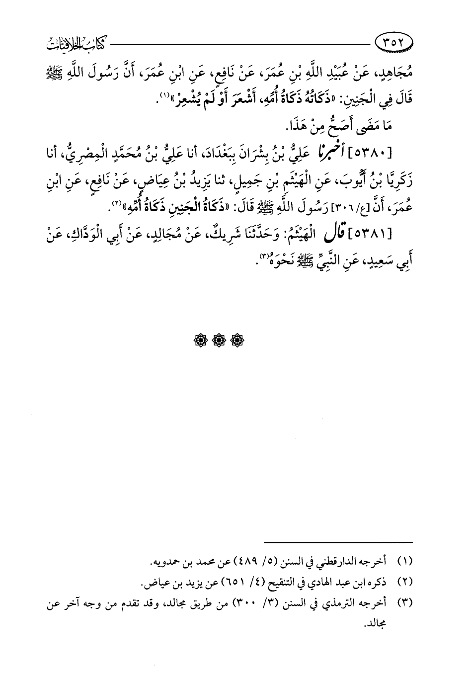 [5380] أخبرنا عَلِيُّ بْنُ بِشْرَانَ بِبَغْدَادَ، أنا عَلِيُّ بْنُ مُحَمَّدٍ الْمِصْرِيُّ، أنا زَكَرِيَّا بْنُ أَيُّوبَ، عَنِ الْهَيْثَمِ بْنِ جَمِيلٍ، ثنا يَزِيدُ بْنُ عِيَاضٍ، عَنْ نَافِعٍ، عَنِ ابْنِ عُمَرَ، أَنَّ رَسُولَ اللَّهِ - صلى الله عليه وسلم - قَالَ: "ذَكَاةُ الْجَنِينِ ذَكَاةُ أُمِّهِ" (¬2).