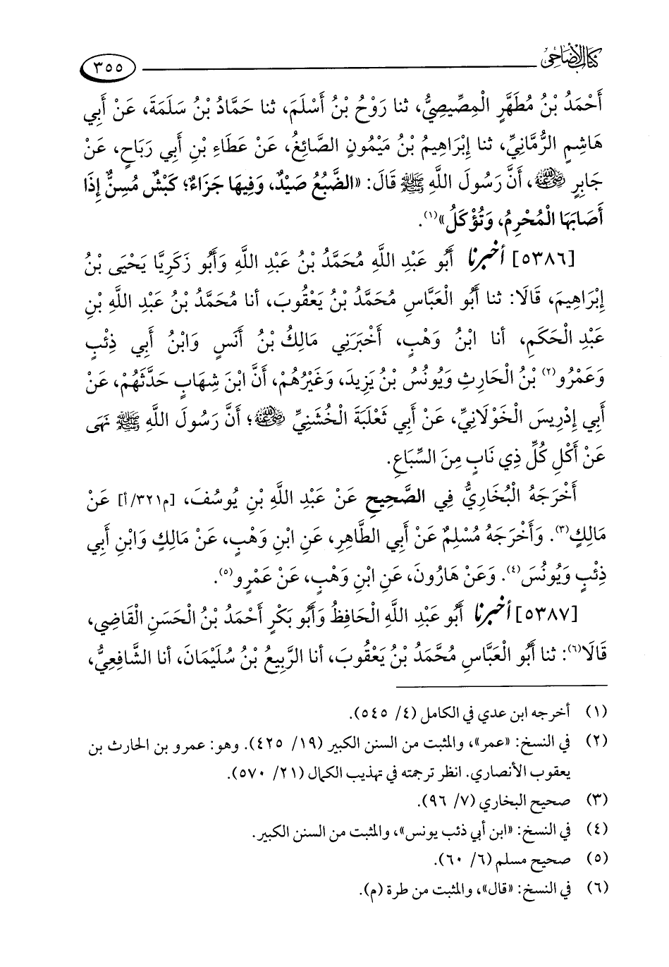 [5386] أخبرنا أَبُو عَبْدِ اللَّهِ مُحَمَّدُ بْنُ عَبْدِ اللَّهِ وَأَبُو زَكَرِيَّا يَحْيَى بْنُ إِبْرَاهِيمَ، قَالَا: ثنا أَبُو الْعَبَّاسِ مُحَمَّدُ بْنُ يَعْقُوبَ، أنا مُحَمَّدُ بْنُ عَبْدِ اللَّهِ بْنِ عَبْدِ الْحَكَمِ، أنا ابْنُ وَهْبٍ، أَخْبَرَنِي مَالِكُ بْنُ أَنَسٍ وَابْنُ أَبِي ذِئْبٍ وَعَمْرُو (¬2) بْنُ الْحَارِثِ وَيُونُسُ بْنُ يَزِيدَ، وَغَيْرُهُمْ، أَنَّ ابْنَ شِهَابٍ حَدَّثَهُمْ، عَنْ أَبِي إِدْرِيسَ الْخَوْلَانِيِّ، عَنْ أَبِي ثَعْلَبَةَ الْخُشَنِيِّ - رضي الله عنه -؛ أَنَّ رَسُولَ اللَّهِ - صلى الله عليه وسلم - نَهَى عَنْ أَكْلِ كُلِّ ذِي نَابٍ مِنَ السِّبَاعِ.