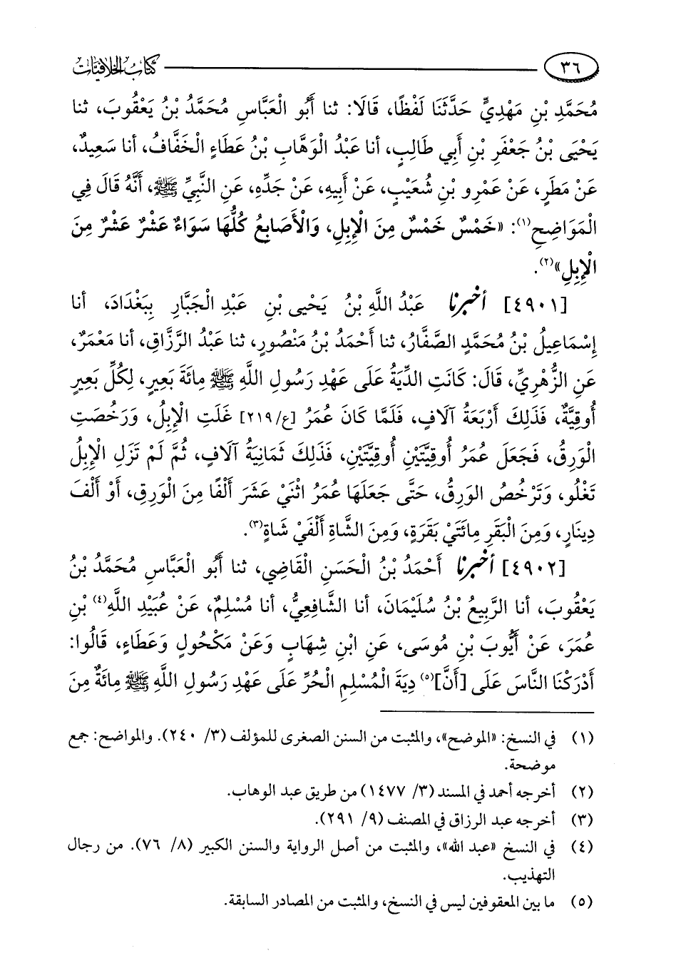 [4902] أخبرنا أَحْمَدُ بْنُ الْحَسَنِ الْقَاضِي، ثنا أَبُو الْعَبَّاسِ مُحَمَّدُ بْنُ يَعْقُوبَ، أنا الرَّبِيعُ بْنُ سُلَيْمَانَ، أنا الشَّافِعِيُّ، أنا مُسْلِمٌ، عَنْ عُبَيْدِ اللَّهِ (¬4) بْنِ عُمَرَ، عَنْ أَيُّوبَ بْنِ مُوسَى، عَنِ ابْنِ شِهَابٍ وَعَنْ مَكْحُولٍ وَعَطَاءٍ، قَالُوا: أَدْرَكْنَا النَّاسَ عَلَى [أَنَّ] (¬5) دِيَةَ الْمُسْلِمِ الْحُرِّ عَلَى عَهْدِ رَسُولِ اللَّهِ - صلى الله عليه وسلم - مِائَةٌ مِنَ