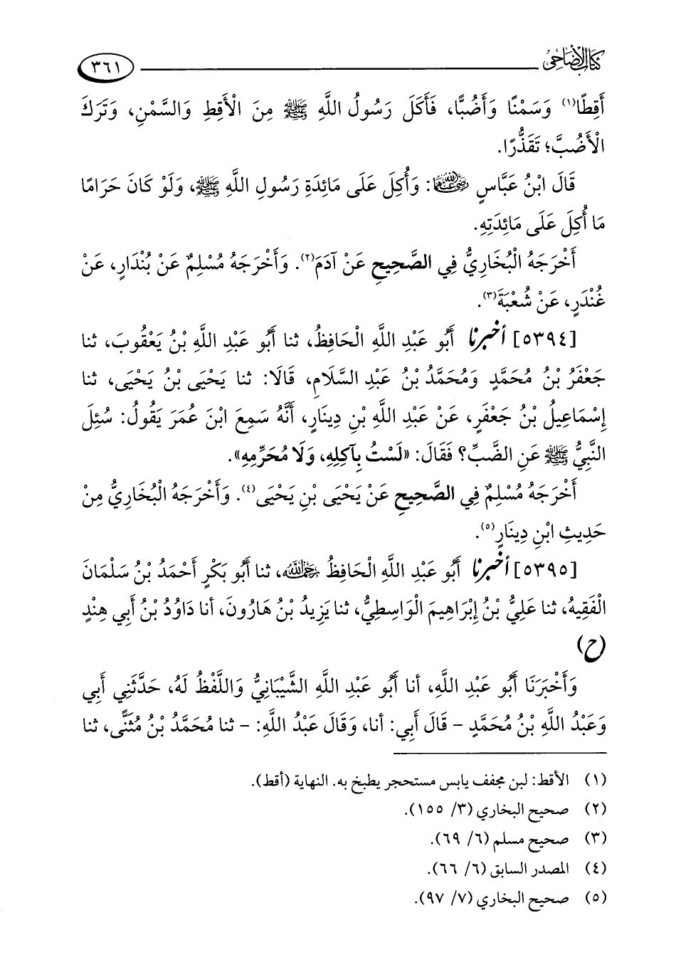 [5394] أخبرنا أَبُو عَبْدِ اللَّهِ الْحَافِظُ، ثنا أَبُو عَبْدِ اللَّهِ بْنُ يَعْقُوبَ، ثنا جَعْفَرُ بْنُ مُحَمَّدٍ وَمُحَمَّدُ بْنُ عَبْدِ السَّلَامِ، قَالَا: ثنا يَحْيَى بْنُ يَحْيَى، ثنا إِسْمَاعِيلُ بْنُ جَعْفَرٍ، عَنْ عَبْدِ اللَّهِ بْنِ دِينَارٍ، أَنَّهُ سَمِعَ ابْنَ عُمَرَ يَقُولُ: سُئِلَ النَّبِيُّ - صلى الله عليه وسلم - عَنِ الضَّبِّ؟ فَقَالَ: "لَسْتُ بِآكِلِهِ، وَلَا مُحَرِّمِهِ".