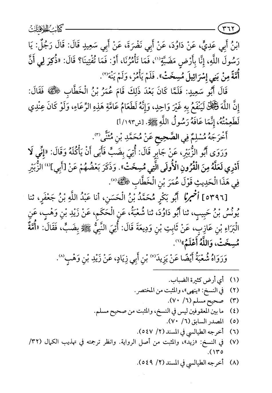 [5396] أخبرنا أَبُو بَكْرٍ مُحَمَّدُ بْنُ الْحَسَنِ، أنا عَبْدُ اللَّهِ بْنُ جَعْفَرٍ، ثنا يُونُسُ بْنُ حَبِيبٍ، ثنا أَبُو دَاوُدَ، ثنا شُعْبَةُ، عَنِ الْحَكَمِ، عَنْ زَيْدِ بْنِ وَهْبٍ، عَنِ الْبَرَاءِ بْنِ عَازِبٍ، عَنْ ثَابِتِ بْنِ وَدِيعَةَ قَالَ: أُتِيَ النَّبِيُّ - صلى الله عليه وسلم - بِضَبٍّ، فَقَالَ: "أُمَّةٌ مُسِخَتْ، وَاللَّهُ أَعْلَمُ" (¬6).