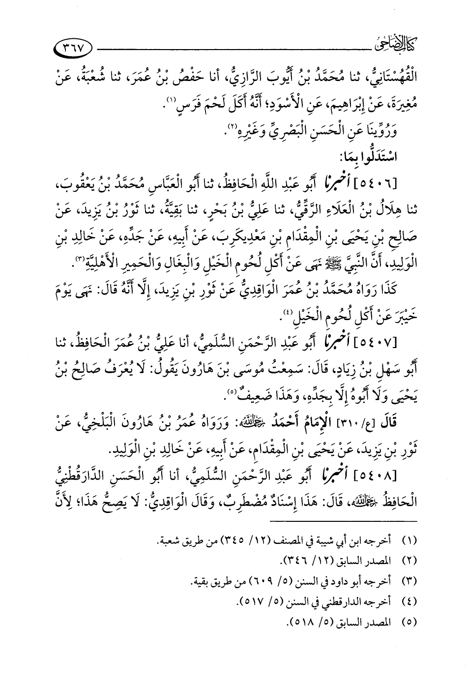 [5406] أخبرنا أَبُو عَبْدِ اللَّهِ الْحَافِظُ، ثنا أَبُو الْعَبَّاسِ مُحَمَّدُ بْنُ يَعْقُوبَ، ثنا هِلَالُ بْنُ الْعَلَاءِ الرَّقِّيُّ، ثنا عَلِيُّ بْنُ بَحْرٍ، ثنا بَقِيَّةُ، ثنا ثَوْرُ بْنُ يَزِيدَ، عَنْ صَالِحِ بْنِ يَحْيَى بْنِ الْمِقْدَامِ بْنِ مَعْدِيكَرِبَ، عَنْ أَبِيهِ، عَنْ جَدِّهِ، عَنْ خَالِدِ بْنِ الْوَلِيدِ، أَنَّ النَّبِيَّ - صلى الله عليه وسلم - نَهَى عَنْ أَكْلِ لُحُومِ الْخَيْلِ وَالْبِغَالِ وَالْحَمِيرِ الْأَهْلِيَّةِ (¬3).