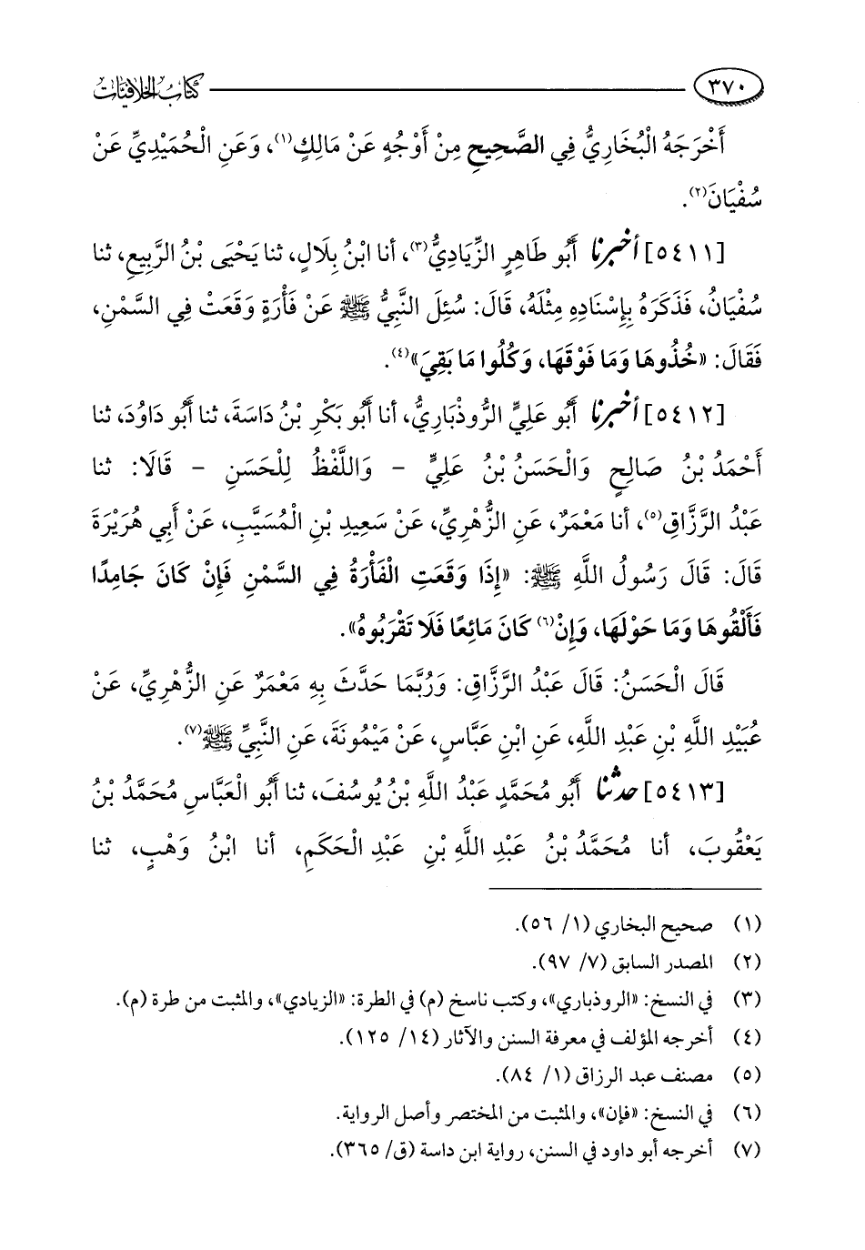 [5411] أخبرنا أَبُو طَاهِرٍ الزِّيَادِيُّ (¬3)، أنا ابْنُ بِلَالٍ، ثنا يَحْيَى بْنُ الرَّبِيعِ، ثنا سُفْيَانُ، فَذَكَرَهُ بِإِسْنَادِهِ مِثْلَهُ، قَالَ: سُئِلَ النَّبِيُّ - صلى الله عليه وسلم - عَنْ فَأْرَةٍ وَقَعَتْ فِي السَّمْنِ، فَقَالَ: "خُذُوهَا وَمَا فَوْقَهَا، وَكُلُوا مَا بَقِيَ" (¬4).