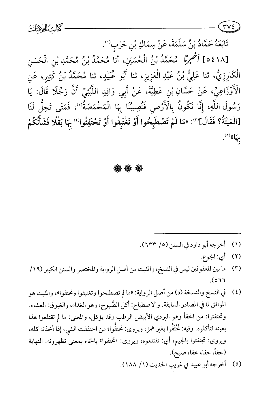[5418] أخبرنا مُحَمَّدُ بْنُ الْحُسَيْنِ، أنا مُحَمَّدُ بْنُ مُحَمَّدِ بْنِ الْحَسَنِ الْكَارِزِيُّ، ثنا عَلِيُّ بْنُ عَبْدِ الْعَزِيزِ، ثنا أَبُو عُبَيْدٍ، ثنا مُحَمَّدُ بْنُ كَثِيرٍ، عَنِ الْأَوْزَاعِيِّ، عَنْ حَسَّانِ بْنِ عَطِيَّةَ، عَنْ أَبِي وَاقِدٍ اللَّيْثِيِّ أَنَّ رَجُلًا قَالَ: يَا رَسُولَ اللَّهِ، إِنَّا نَكُونُ بِالْأَرْضِ فَتُصِيبُنَا بِهَا الْمَخْمَصَةُ (¬2)، فَمَتَى تَحِلُّ لَنَا [الْمَيْتَةُ؟ فَقَالَ] (¬3): "مَا لَمْ تَصْطَبِحُوا أَوْ تَغْتَبِقُوا أَوْ تَحْتَفِئُوا (¬4) بِهَا بَقْلًا فَشَأْنُكُمْ بِهَا" (¬5).