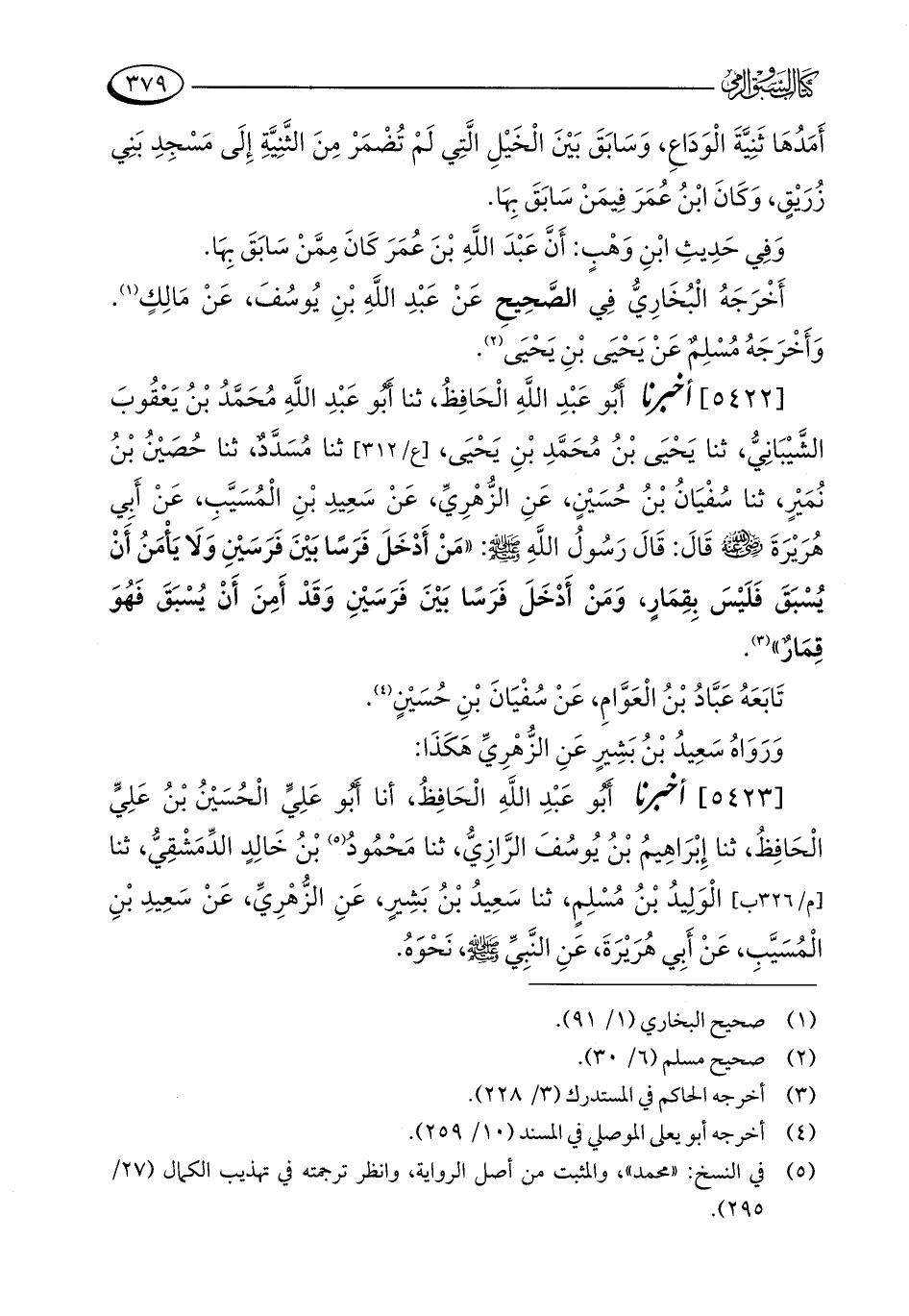 [5423] أخبرنا أَبُو عَبْدِ اللَّهِ الْحَافِظُ، أنا أَبُو عَلِيٍّ الْحُسَيْنُ بْنُ عَلِيٍّ الْحَافِظُ، ثنا إِبْرَاهِيمُ بْنُ يُوسُفَ الرَّازِيُّ، ثنا مَحْمُودُ (¬5) بْنُ خَالِدٍ الدِّمَشْقِيُّ، ثنا الْوَلِيدُ بْنُ مُسْلِمٍ، ثنا سَعِيدُ بْنُ بَشِيرٍ، عَنِ الزُّهْرِيِّ، عَنْ سَعِيدِ بْنِ الْمُسَيَّبِ، عَنْ أَبِي هُرَيْرَةَ، عَنِ النَّبِيِّ - صلى الله عليه وسلم -، نَحْوَهُ.