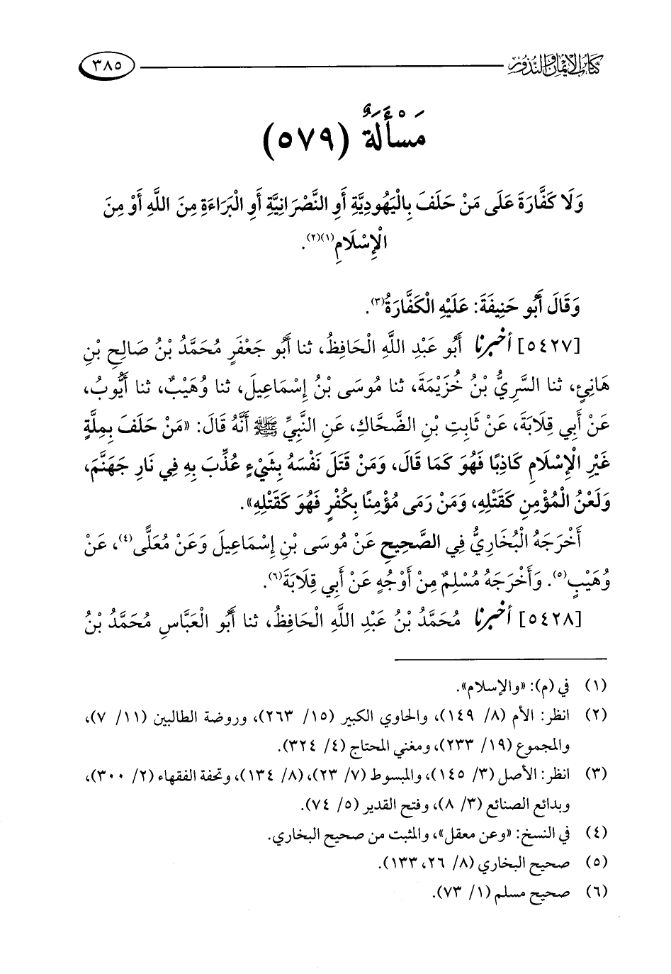 [5427] أخبرنا أَبُو عَبْدِ اللَّهِ الْحَافِظُ، ثنا أَبُو جَعْفَرٍ مُحَمَّدُ بْنُ صَالِحِ بْنِ هَانِئٍ، ثنا السَّرِيُّ بْنُ خُزَيْمَةَ، ثنا مُوسَى بْنُ إِسْمَاعِيلَ، ثنا وُهَيْبٌ، ثنا أَيُّوبُ، عَنْ أَبِي قِلَابَةَ، عَنْ ثَابِتِ بْنِ الضَّحَّاكِ، عَنِ النَّبِيِّ - صلى الله عليه وسلم - أَنَّهُ قَالَ: "مَنْ حَلَفَ بِمِلَّةٍ غَيْرِ الْإِسْلَامِ كَاذِبًا فَهُوَ كَمَا قَالَ، وَمَنْ قَتَلَ نَفْسَهُ بِشَيْءٍ عُذِّبَ بِهِ فِي نَارِ جَهَنَّمَ، وَلَعْنُ الْمُؤْمِنِ كَقَتْلِهِ، وَمَنْ رَمَى مُؤْمِنًا بِكُفْرٍ فَهُوَ كَقَتْلِهِ".