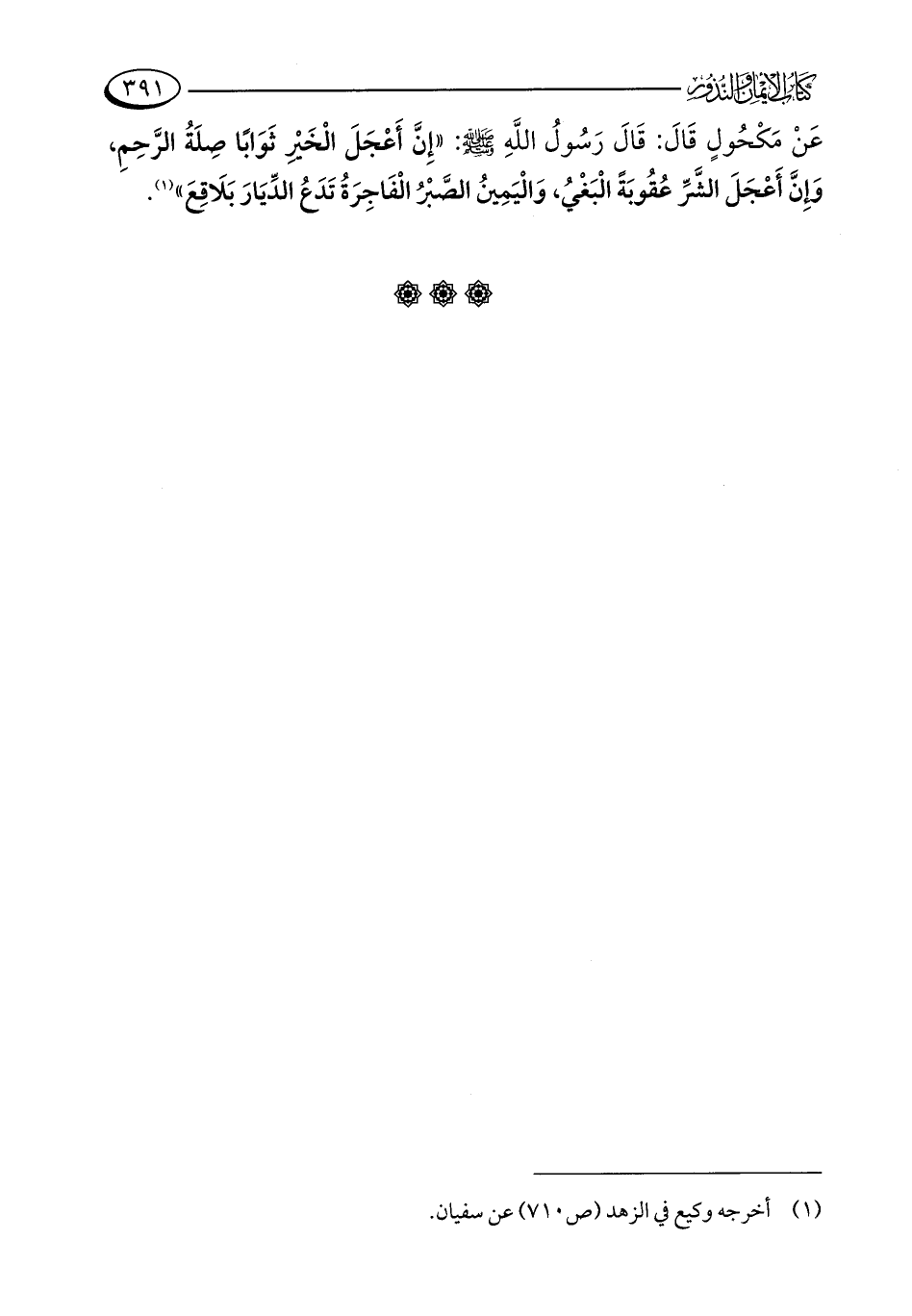 عَنْ مَكْحُولٍ قَالَ: قَالَ رَسُولُ اللَّهِ - صلى الله عليه وسلم -: "إِنَّ أَعْجَلَ الْخَيْرِ ثَوَابًا صِلَةُ الرَّحِمِ، وَإِنَّ أَعْجَلَ الشَّرِّ عُقُوبَةً الْبَغْيُ، وَالْيَمِينُ الصَّبْرُ الْفَاجِرَةُ تَدَعُ الدِّيَارَ بَلَاقِعَ" (¬1).