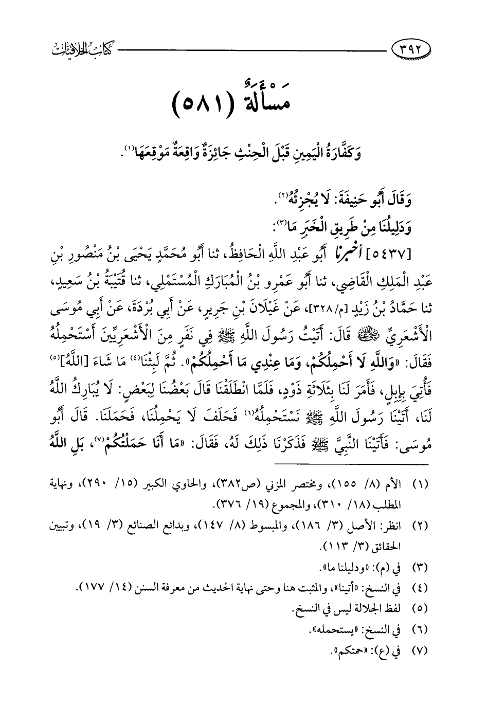 [5437] أخبرنا أَبُو عَبْدِ اللَّهِ الْحَافِظُ، ثنا أَبُو مُحَمَّدٍ يَحْيَى بْنُ مَنْصُورِ بْنِ عَبْدِ الْمَلِكِ الْقَاضِي، ثنا أَبُو عَمْرِو بْنُ الْمُبَارَكِ الْمُسْتَمْلِي، ثنا قُتَيْبَةُ بْنُ سَعِيدٍ، ثنا حَمَّادُ بْنُ زَيْدٍ، عَنْ غَيْلَانَ بْنِ جَرِيرٍ، عَنْ أَبِي بُرْدَةَ، عَنْ أَبِي مُوسَى الْأَشْعَرِيِّ - رضي الله عنه - قَالَ: أَتَيْتُ رَسُولَ اللَّهِ - صلى الله عليه وسلم - فِي نَفَرٍ مِنَ الْأَشْعَرِيِّينَ أَسْتَحْمِلُهُ فَقَالَ: "وَاللَّهِ لَا أَحْمِلُكُمْ، وَمَا عِنْدِي مَا أَحْمِلُكُمْ". ثُمَّ لَبِثْنَا (¬4) مَا شَاءَ [اللَّهُ] (¬5) فَأُتِيَ بِإِبِلٍ، فَأَمَرَ لَنَا بِثَلَاثَةِ ذَوْدٍ، فَلَمَّا انْطَلَقْنَا قَالَ بَعْضُنَا لِبَعْضٍ: لَا يُبَارِكُ اللَّهُ لَنَا، أَتَيْنَا رَسُولَ اللَّهِ - صلى الله عليه وسلم - نَسْتَحْمِلُهُ (¬6) فَحَلَفَ لَا يَحْمِلُنَا، فَحَمَلَنَا. قَالَ أَبُو مُوسَى: فَأَتَيْنَا النَّبِيَّ - صلى الله عليه وسلم - فذَكَرْنَا ذَلِكَ لَهُ، فَقَالَ: "مَا أَنَا حَمَلْتُكُمْ (¬7)، بَلِ اللَّهُ