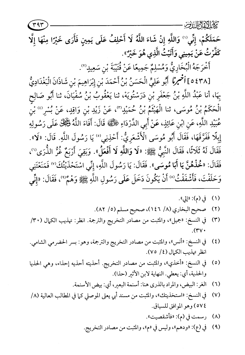 [5438] أخبرنا أَبُو عَلِيٍّ الْحَسَنُ بْنُ أَحْمَدَ بْنِ إِبْرَاهِيمَ بْنِ شَاذَانَ الْبَغْدَادِيُّ بِهَا، أنا عَبْدُ اللَّهِ بْنُ جَعْفَرِ بْنِ دَرَسْتُويَهْ، ثنا يَعْقُوبُ بْنُ سُفْيَانَ، ثنا أَبُو صَالِحٍ الْحَكَمُ بْنُ مُوسَى، ثنا الْهَيْثَمُ بْنُ حُمَيْدٍ (¬3)، عَنْ زَيْدِ بْنِ وَاقِدٍ، عَنْ بُسْرِ (¬4) بْنِ عُبَيْدِ اللَّهِ، عَنِ ابْنِ عَائِذٍ، عَنْ أَبِي الدَّرْدَاءِ - رضي الله عنه - قَالَ: أَفَاءَ اللَّهُ - عز وجل - عَلَى رَسُولِهِ إِبِلًا فَفَرَّقَهَا، فَقَالَ أَبُو مُوسَى الْأَشْعَرِيُّ: أَحْذِنِي (¬5) يَا رَسُولَ اللَّهِ. قَالَ: "لَا". فَقَالَ لَهُ ثَلَاثًا، فَقَالَ النَّبِيُّ - صلى الله عليه وسلم -: "لَا وَاللَّهِ لَا أَفْعَلُ". وَبَقِيَ أَرْبَعٌ غُرُّ الذُّرَى (¬6)، فَقَالَ: "خُذْهُنَّ يَا أَبَا مُوسَى". فَقَالَ: يَا رَسُولَ اللَّهِ، إِنِّي اسْتَحْذَيْتُكَ (¬7) فَمَنَعْتَنِي وَحَلَفْتَ، فَأَشْفَقْتُ (¬8) أَنْ يَكُونَ دَخَلَ عَلَى رَسُولِ اللَّهِ - صلى الله عليه وسلم - وَهْمٌ (¬9)، فَقَالَ: "إِنِّي