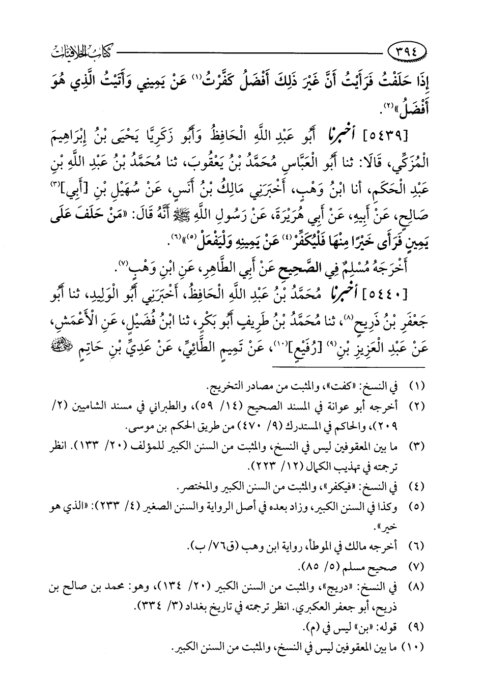 [5439] أخبرنا أَبُو عَبْدِ اللَّهِ الْحَافِظُ وَأَبُو زَكَرِيَّا يَحْيَى بْنُ إِبْرَاهِيمَ الْمُزَكِّي، قَالَا: ثنا أَبُو الْعَبَّاسِ مُحَمَّدُ بْنُ يَعْقُوبَ، ثنا مُحَمَّدُ بْنُ عَبْدِ اللَّهِ بْنِ عَبْدِ الْحَكَمِ، أنا ابْنُ وَهْبٍ، أَخْبَرَنِي مَالِكُ بْنُ أَنَسٍ، عَنْ سُهَيْلِ بْنِ [أَبِي] (¬3) صَالِحٍ، عَنْ أَبِيهِ، عَنْ أَبِي هُرَيْرَةَ، عَنْ رَسُولِ اللَّهِ - صلى الله عليه وسلم - أَنَّهُ قَالَ: "مَنْ حَلَفَ عَلَى يَمِينٍ فَرَأَى خَيْرًا مِنْهَا فَلْيُكَفِّرْ (¬4) عَنْ يَمِينِهِ وَلْيَفْعَلْ (¬5) " (¬6).