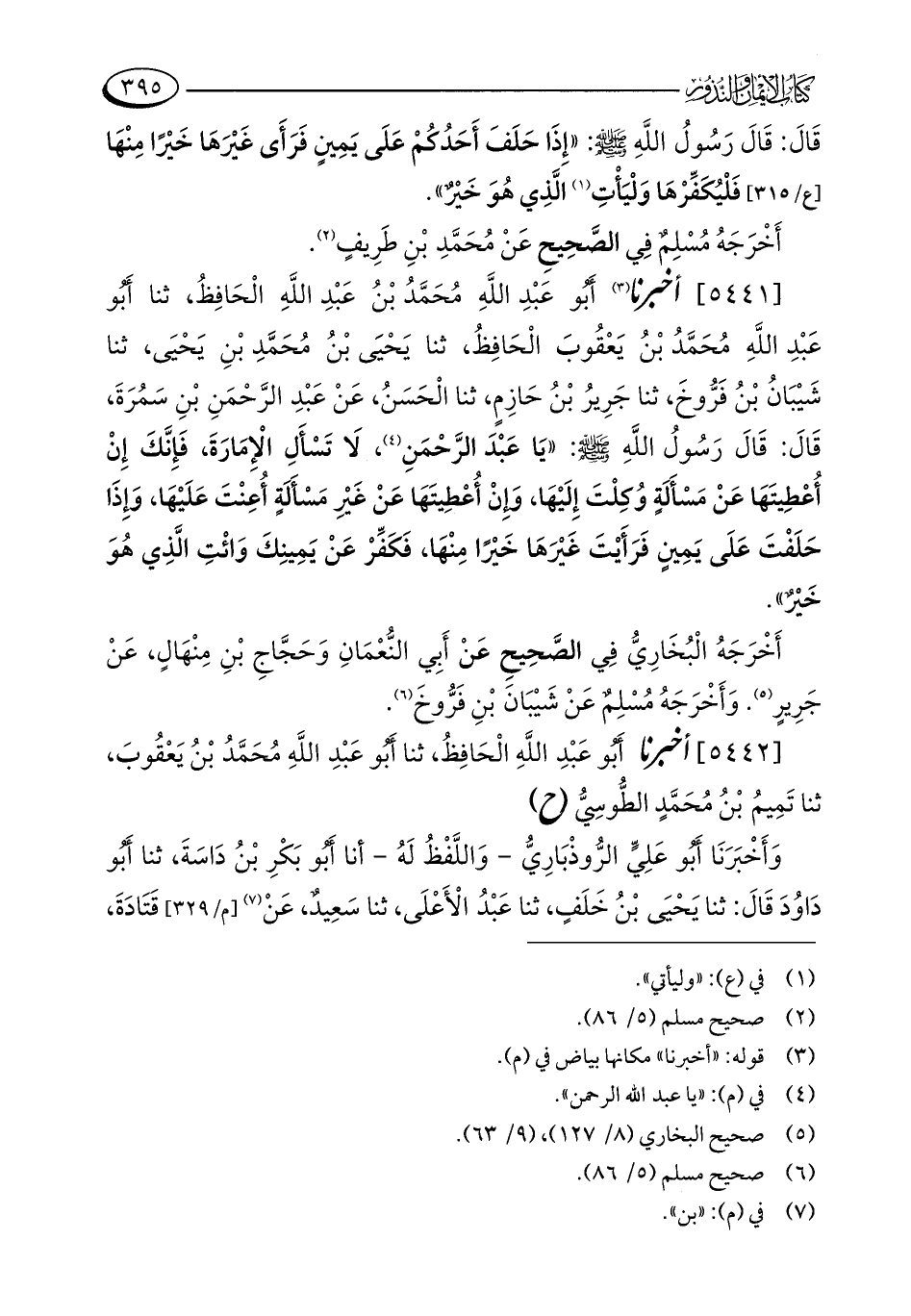 [5441] أخبرنا (¬3) أَبُو عَبْدِ اللَّهِ مُحَمَّدُ بْنُ عَبْدِ اللَّهِ الْحَافِظُ، ثنا أَبُو عَبْدِ اللَّهِ مُحَمَّدُ بْنُ يَعْقُوبَ الْحَافِظُ، ثنا يَحْيَى بْنُ مُحَمَّدِ بْنِ يَحْيَى، ثنا شَيْبَانُ بْنُ فَرُّوخَ، ثنا جَرِيرُ بْنُ حَازِمٍ، ثنا الْحَسَنُ، عَنْ عَبْدِ الرَّحْمَنِ بْنِ سَمُرَةَ، قَالَ: قَالَ رَسُولُ اللَّهِ - صلى الله عليه وسلم -: "يَا عَبْدَ الرَّحْمَنِ (¬4)، لَا تَسْأَلِ الْإِمَارَةَ، فَإِنَّكَ إِنْ أُعْطِيتَهَا عَنْ مَسْأَلَةٍ وُكِلْتَ إِلَيْهَا، وَإِنْ أُعْطِيتَهَا عَنْ غَيْرِ مَسْأَلَةٍ أُعِنْتَ عَلَيْهَا، وَإِذَا حَلَفْتَ عَلَى يَمِين فَرَأَيْتَ غَيْرَهَا خَيْرًا مِنْهَا، فَكَفِّرْ عَنْ يَمِينِكَ وَائْتِ الَّذِي هُوَ خَيْرٌ".