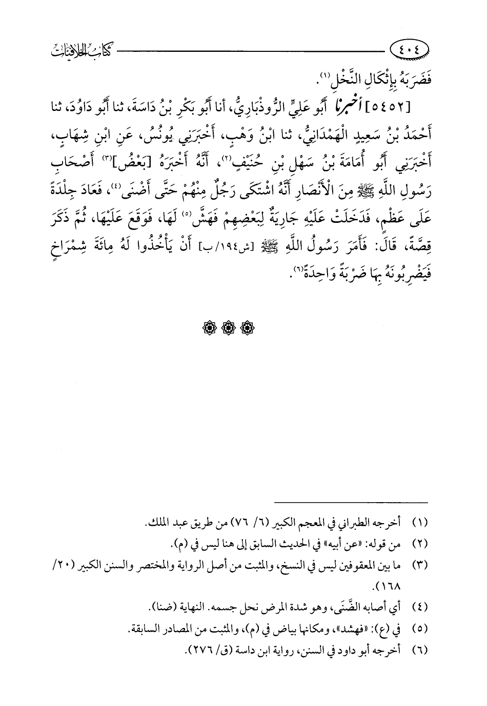 [5452] أخبرنا أَبُو عَلِيٍّ الرُّوذْبَارِيُّ، أنا أَبُو بَكْرِ بْنُ دَاسَةَ، ثنا أَبُو دَاوُدَ، ثنا أَحْمَدُ بْنُ سَعِيدٍ الْهَمْدَانِيُّ، ثنا ابْنُ وَهْبٍ، أَخْبَرَنِي يُونُسُ، عَنِ ابْنِ شِهَابٍ، أَخْبَرَنِي أَبُو أُمَامَةَ بْنُ سَهْلِ بْنِ حُنَيْفٍ (¬2)، أَنَّهُ أَخْبَرَهُ [بَعْضُ] (¬3) أَصْحَابِ رَسُولِ اللَّهِ - صلى الله عليه وسلم - مِنَ الْأَنْصَارِ أَنَّهُ اشْتَكَى رَجُلٌ مِنْهُمْ حَتَّى أَضْنَى (¬4)، فَعَادَ جِلْدَةً عَلَى عَظْمٍ، فَدَخَلَتْ عَلَيْهِ جَارِيَةٌ لِبَعْضِهِمْ فَهَشَّ (¬5) لَهَا، فَوَقَعَ عَلَيْهَا، ثُمَّ ذَكَرَ قِصَّةً، قَالَ: فَأَمَرَ رَسُولُ اللَّهِ - صلى الله عليه وسلم - أَنْ يَأْخُذُوا لَهُ مِائَةَ شِمْرَاخٍ فَيَضْرِبُونَهُ بِهَا ضَرْبَةً وَاحِدَةً (¬6).