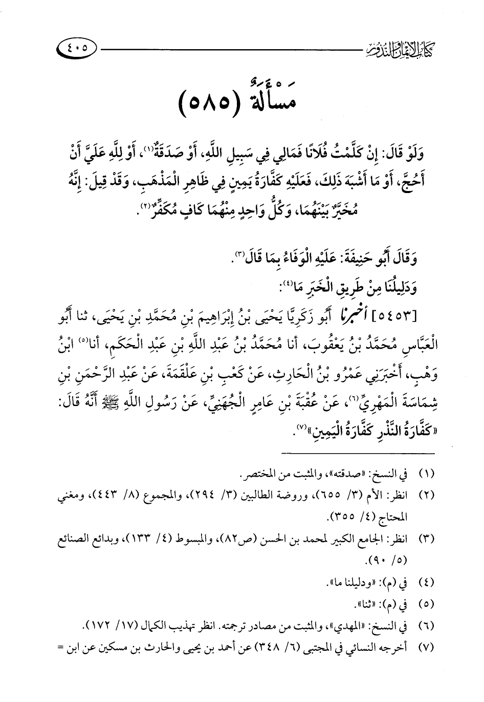 مَسْأَلَةٌ (585): وَلَوْ قَالَ: إِنْ كَلَّمْتُ فُلَانًا فَمَالِي فِي سَبِيلِ اللَّهِ، أَوْ صَدَقَةٌ (¬1)، أَوْ لِلَّهِ عَلَيَّ أَنْ أَحُجَّ، أَوْ مَا أَشْبَهَ ذَلِكَ، فَعَلَيْهِ كَفَّارَةُ يَمِينٍ فِي ظَاهِرِ الْمَذْهَبِ، وَقَدْ قِيلَ: إِنَّهُ مُخَيَّرٌ بَيْنَهُمَا، وَكُلُّ وَاحِدٍ مِنْهُمَا كَافٍ مُكَفِّرٌ (¬2).