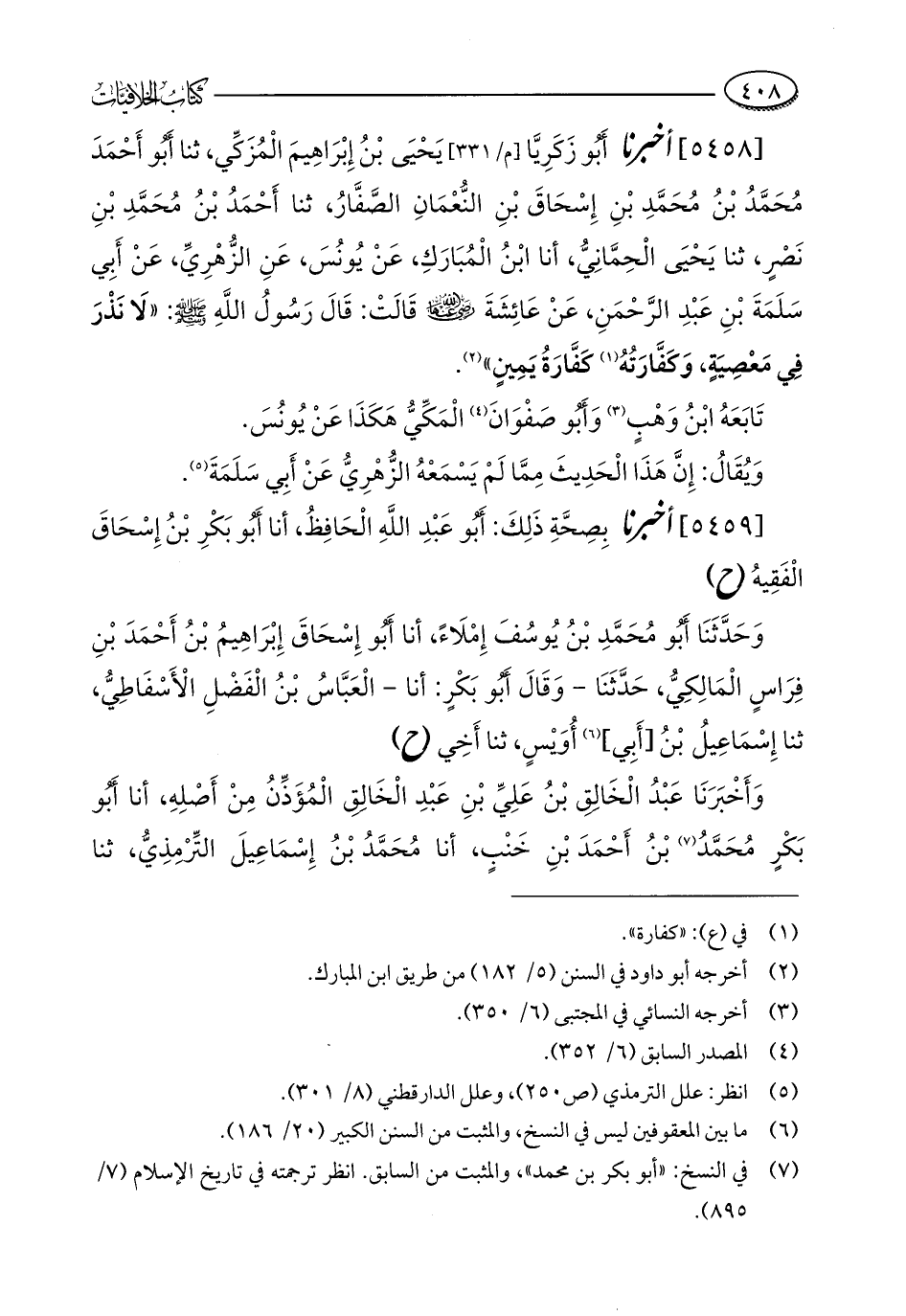 [5458] أخبرنا أَبُو زَكَرِيَّا يَحْيَى بْنُ إِبْرَاهِيمَ الْمُزَكِّي، ثنا أَبُو أَحْمَدَ مُحَمَّدُ بْنُ مُحَمَّدِ بْنِ إِسْحَاقَ بْنِ النُّعْمَانِ الصَّفَّارُ، ثنا أَحْمَدُ بْنُ مُحَمَّدِ بْنِ نَصْرٍ، ثنا يَحْيَى الْحِمَّانِيُّ، أنا ابْنُ الْمُبَارَكِ، عَنْ يُونُسَ، عَنِ الزُّهْرِيِّ، عَنْ أَبِي سَلَمَةَ بْنِ عَبْدِ الرَّحْمَنِ، عَنْ عَائِشَةَ - رضي الله عنها - قَالَتْ: قَالَ رَسُولُ اللَّهِ - صلى الله عليه وسلم -: "لَا نَذْرَ فِي مَعْصِيَةٍ، وَكَفَّارَتُهُ (¬1) كَفَّارَةُ يَمِينٍ" (¬2).