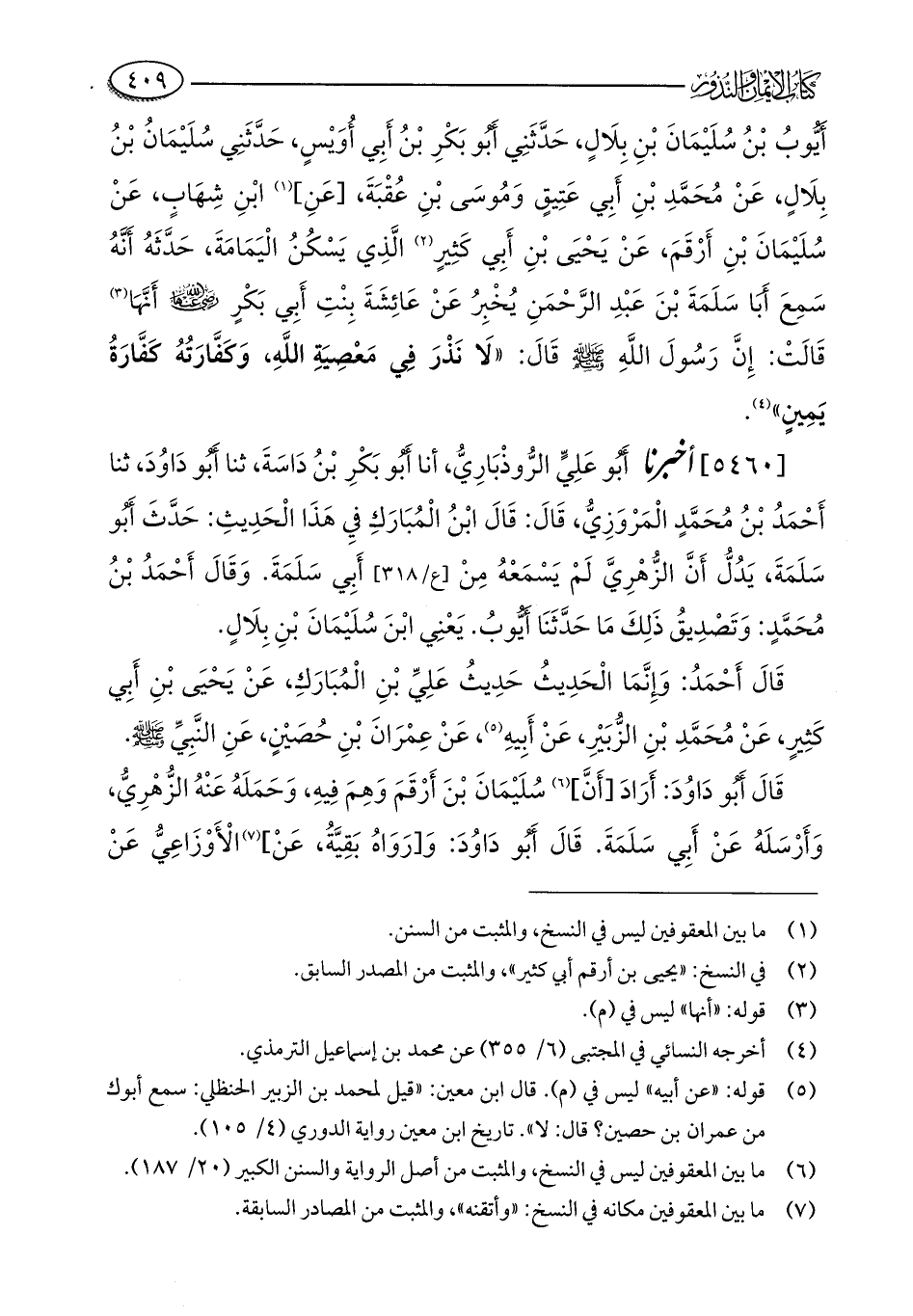 أَيُّوبُ بْنُ سُليْمَان بْنِ بِلالٍ، حَدَّثَنِي أَبُو بَكْرِ بْنُ أبِي أُوَيْسٍ، حَدَّثَنِي سُلَيْمَانُ بْنُ بِلَالٍ، عَنْ مُحَمَّدِ بْنِ أَبِي عَتِيقٍ وَمُوسَى بْنِ عُقْبَةَ، [عَنِ] (¬1) ابْنِ شِهَابٍ، عَنْ سُلَيْمَانَ بْنِ أَرْقَمَ، عَنْ يَحْيَى بْنِ أَبِي كَثِيرٍ (¬2) الَّذِي يَسْكُنُ الْيَمَامَةَ، حَدَّثَهُ أَنَّهُ سَمِعَ أَبَا سَلَمَةَ بْنَ عَبْدِ الرَّحْمَنِ يُخْبِرُ عَنْ عَائِشَةَ بِنْتِ أَبِي بَكْرٍ - رضي الله عنها - أَنَّهَا (¬3) قَالَتْ: إِنَّ رَسُولَ اللَّهِ - صلى الله عليه وسلم - قَالَ: "لَا نَذْرَ فِي مَعْصِيَةِ اللَّهِ، وَكَفَّارَتُهُ كَفَّارَةُ يَمِينٍ" (¬4).