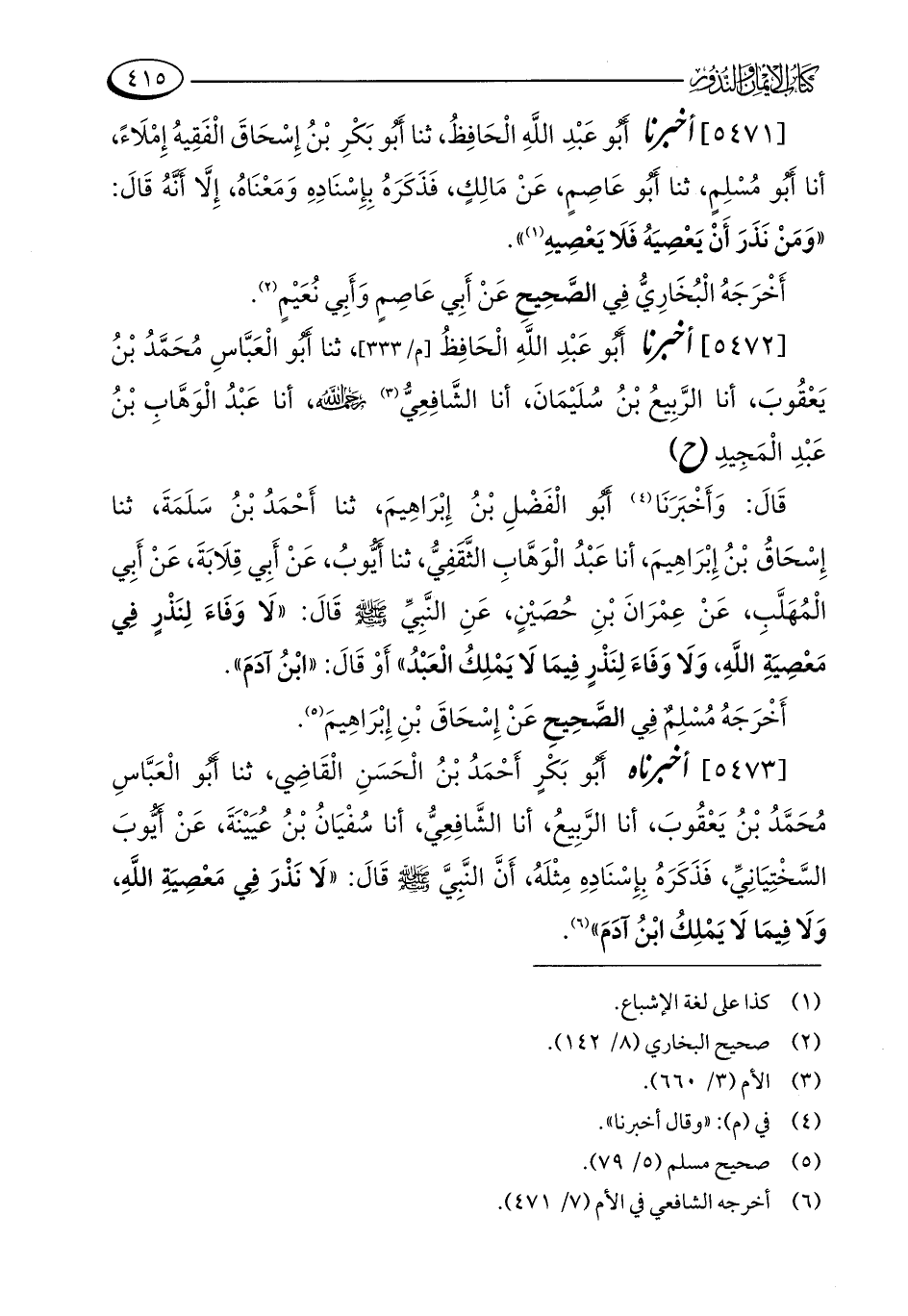 [5473] أخبرناه أَبُو بَكْرٍ أَحْمَدُ بْنُ الْحَسَنِ الْقَاضِي، ثنا أَبُو الْعَبَّاسِ مُحَمَّدُ بْنُ يَعْقُوبَ، أنا الرَّبِيعُ، أنا الشَّافِعِيُّ، أنا سُفْيَانُ بْنُ عُيَيْنَةَ، عَنْ أَيُّوب السَّخْتِيَانِيِّ، فَذَكَرَهُ بِإِسْنَادِهِ مِثْلَهُ، أَنَّ النَّبِيَّ - صلى الله عليه وسلم - قَالَ: "لَا نَذْرَ فِي مَعْصِيَةِ اللَّهِ، وَلَا فِيمَا لَا يَمْلِكُ ابْنُ آدَمَ" (¬6).