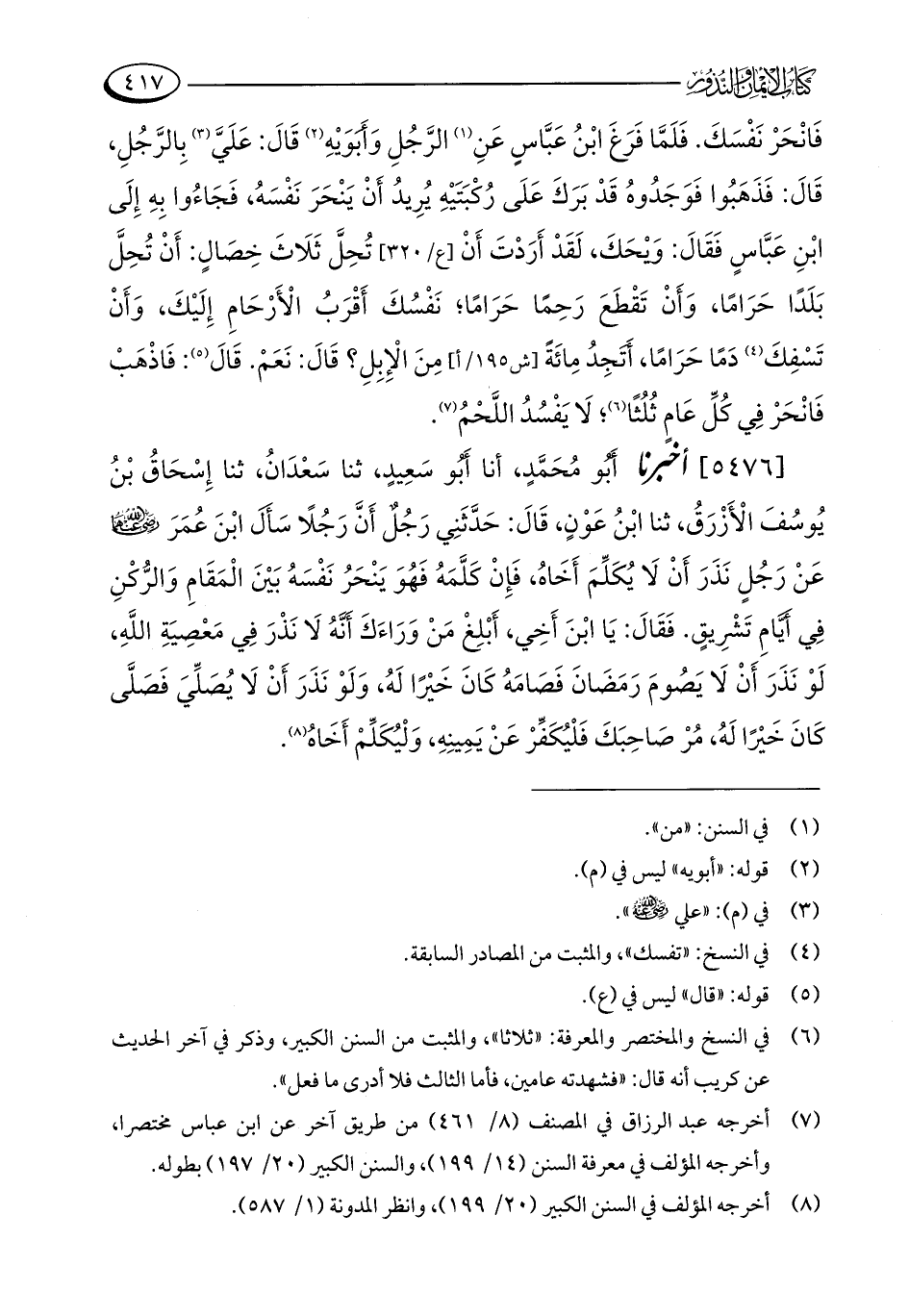 [5476] أخبرنا أَبُو مُحَمَّدٍ، أنا أَبُو سَعِيدٍ، ثنا سَعْدَانُ، ثنا إِسْحَاقُ بْنُ يُوسُفَ الْأَزْرَقُ، ثنا ابْنُ عَوْنٍ، قَالَ: حَدَّثَنِي رَجُلٌ أَنَّ رَجُلًا سَأَلَ ابْنَ عُمَرَ - رضي الله عنهما - عَنْ رَجُلٍ نَذَرَ أَنْ لَا يُكَلِّمَ أَخَاهُ، فَإِنْ كَلَّمَهُ فَهُوَ يَنْحَرُ نَفْسَهُ بَيْنَ الْمَقَامِ وَالرُّكْنِ فِي أَيَّامِ تَشْرِيقٍ. فَقَالَ: يَا ابْنَ أَخِي، أَبْلِغْ مَنْ وَرَاءَكَ أَنَّهُ لَا نَذْرَ فِي مَعْصِيَةِ اللَّهِ، لَوْ نَذَرَ أَنْ لَا يَصُومَ رَمَضَانَ فَصَامَهُ كَانَ خَيْرًا لَهُ، وَلَوْ نَذَرَ أَنْ لَا يُصَلِّيَ فَصَلَّى كَانَ خَيْرًا لَهُ، مُرْ صَاحِبَكَ فَلْيُكَفِّرْ عَنْ يَمِينِهِ، وَلْيُكَلِّمْ أَخَاهُ (¬8).