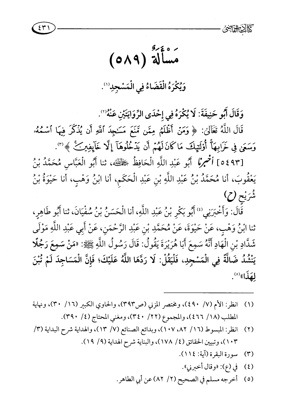 مَسْأَلَةٌ (589): وَيُكْرَهُ الْقَضَاءُ فِي الْمَسْجِدِ (¬1).