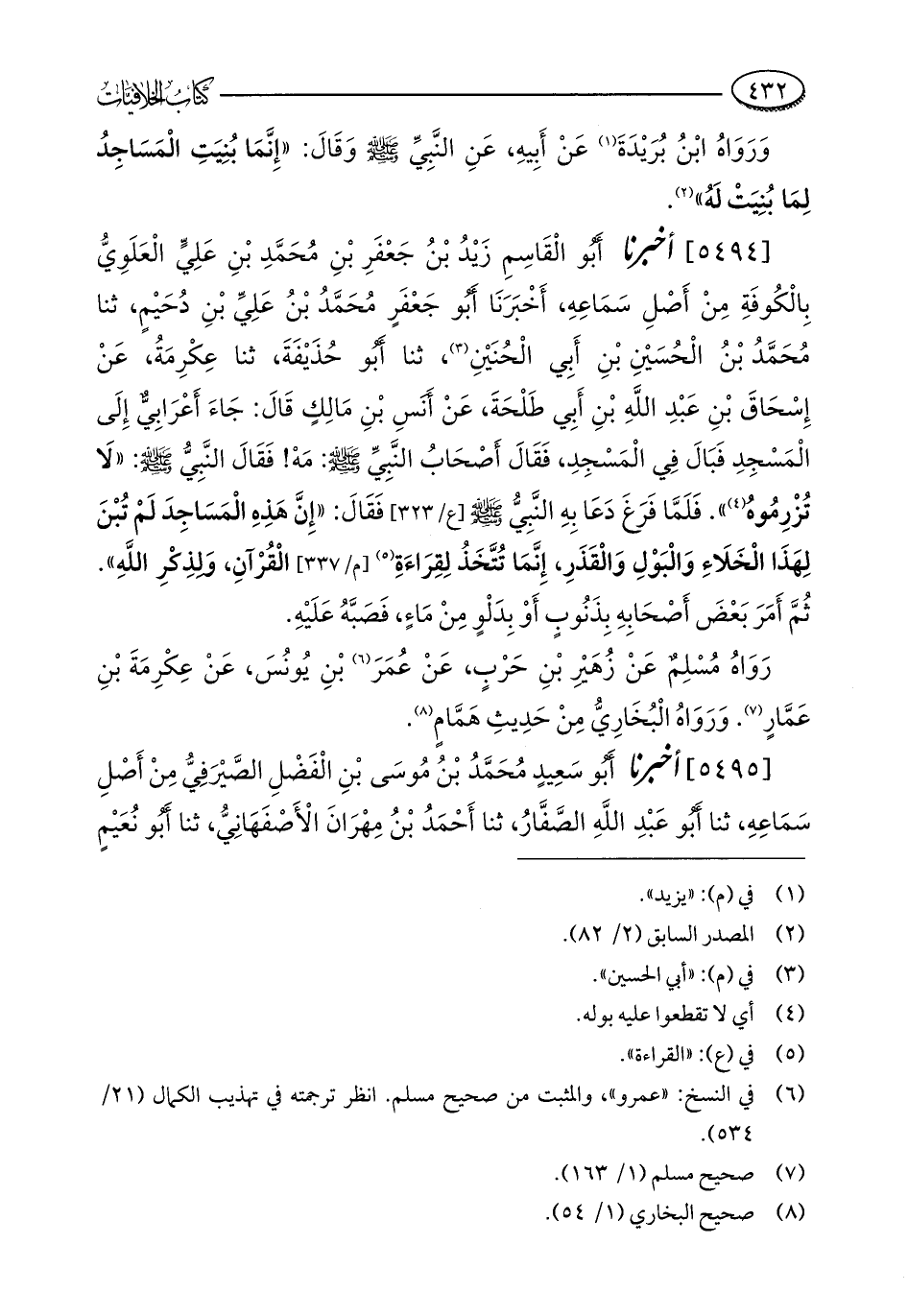 [5494] أخبرنا أَبُو الْقَاسِمِ زَيْدُ بْنُ جَعْفَرِ بْنِ مُحَمَّدِ بْنِ عَلِيٍّ الْعَلَوِيُّ بِالْكُوفَةِ مِنْ أَصْلِ سَمَاعِهِ، أَخْبَرَنَا أَبُو جَعْفَرٍ مُحَمَّدُ بْنُ عَلِيِّ بْنِ دُحَيْمٍ، ثنا مُحَمَّدُ بْنُ الْحُسَيْنِ بْنِ أَبِي الْحُنَيْنِ (¬3)، ثنا أَبُو حُذَيْفَةَ، ثنا عِكْرِمَةُ، عَنْ إِسْحَاقَ بْنِ عَبْدِ اللَّهِ بْنِ أَبِي طَلْحَةَ، عَنْ أَنَسِ بْنِ مَالِكٍ قَالَ: جَاءَ أَعْرَابِيٌّ إِلَى الْمَسْجِدِ فَبَالَ فِي الْمَسْجِدِ، فَقَالَ أَصْحَابُ النَّبِيِّ - صلى الله عليه وسلم -: مَهْ! فَقَالَ النَّبِيُّ - صلى الله عليه وسلم -: "لَا تُزْرِمُوهُ (¬4) ". فَلَمَّا فَرَغَ دَعَا بِهِ النَّبِيُّ - صلى الله عليه وسلم - فَقَالَ: "إِنَّ هَذِهِ الْمَسَاجِدَ لَمْ تُبْنَ لِهَذَا الْخَلَاءِ وَالْبَوْلِ وَالْقَذَرِ، إِنَّمَا تُتَّخَذُ لِقِرَاءَةِ (¬5) الْقُرْآنِ، وَلِذِكْرِ اللَّهِ". ثُمَّ أَمَرَ بَعْضَ أَصْحَابِهِ بِذَنُوبٍ أَوْ بِدَلْوٍ مِنْ مَاءٍ، فَصَبَّهُ عَلَيْهِ.