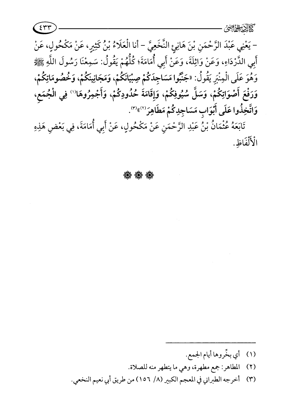 - يَعْنِي عَبْدَ الرَّحْمَنِ بْنَ هَانِئٍ النَّخَعِيَّ - أنا الْعَلَاءُ بْنُ كَثِيرٍ، عَنْ مَكْحُولٍ، عَنْ أَبِي الدَّرْدَاءِ، وَعَنْ وَاثِلَةَ، وَعَنْ أَبِي أُمَامَةَ؛ كُلُّهُمْ يَقُولُ: سَمِعْنَا رَسُولَ اللَّهِ - صلى الله عليه وسلم - وَهُوَ عَلَى الْمِنْبَرِ يَقُولُ: "جَنِّبُوا مَسَاجِدَكُمْ صِبْيَانَكُمْ، وَمَجَانِينَكُمْ، وَخُصُومَاتِكُمْ، وَرَفْعَ أَصْوَاتِكُمْ، وَسَلَّ سُيُوفِكُمْ، وَإِقَامَةَ حُدُودِكُمْ، وَأَجْمِرُوهَا (¬1) فِي الْجُمَعِ، وَاتَّخِذُوا عَلَى أَبْوَابِ مَسَاجِدِكُمْ مَطَاهِرَ (¬2) " (¬3).