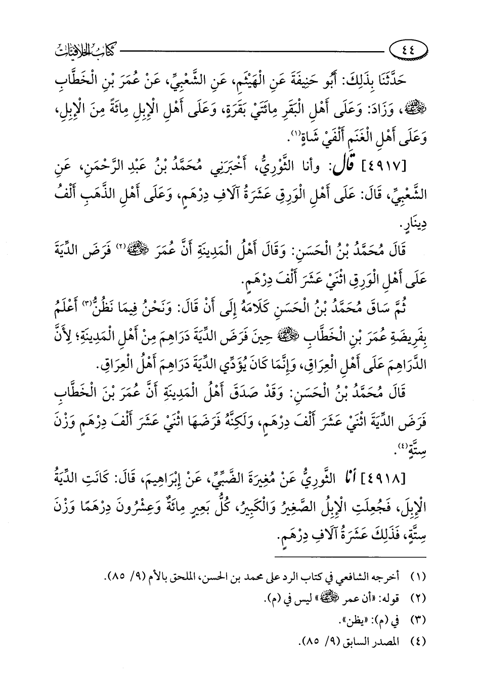 حَدَّثَنَا بِذَلِكَ: أَبُو حَنِيفَةَ عَنِ الْهَيْثَمِ، عَنِ الشَّعْبِيِّ، عَنْ عُمَرَ بْنِ الْخَطَّابِ - رضي الله عنه -، وَزَادَ: وَعَلَى أَهْلِ الْبَقَرِ مِائَتَيْ بَقَرَةٍ، وَعَلَى أَهْلِ الْإِبِلِ مِائَةً مِنَ الْإِبِلِ، وَعَلَى أَهْلِ الْغَنَمِ أَلْفَيْ شَاةٍ (¬1).