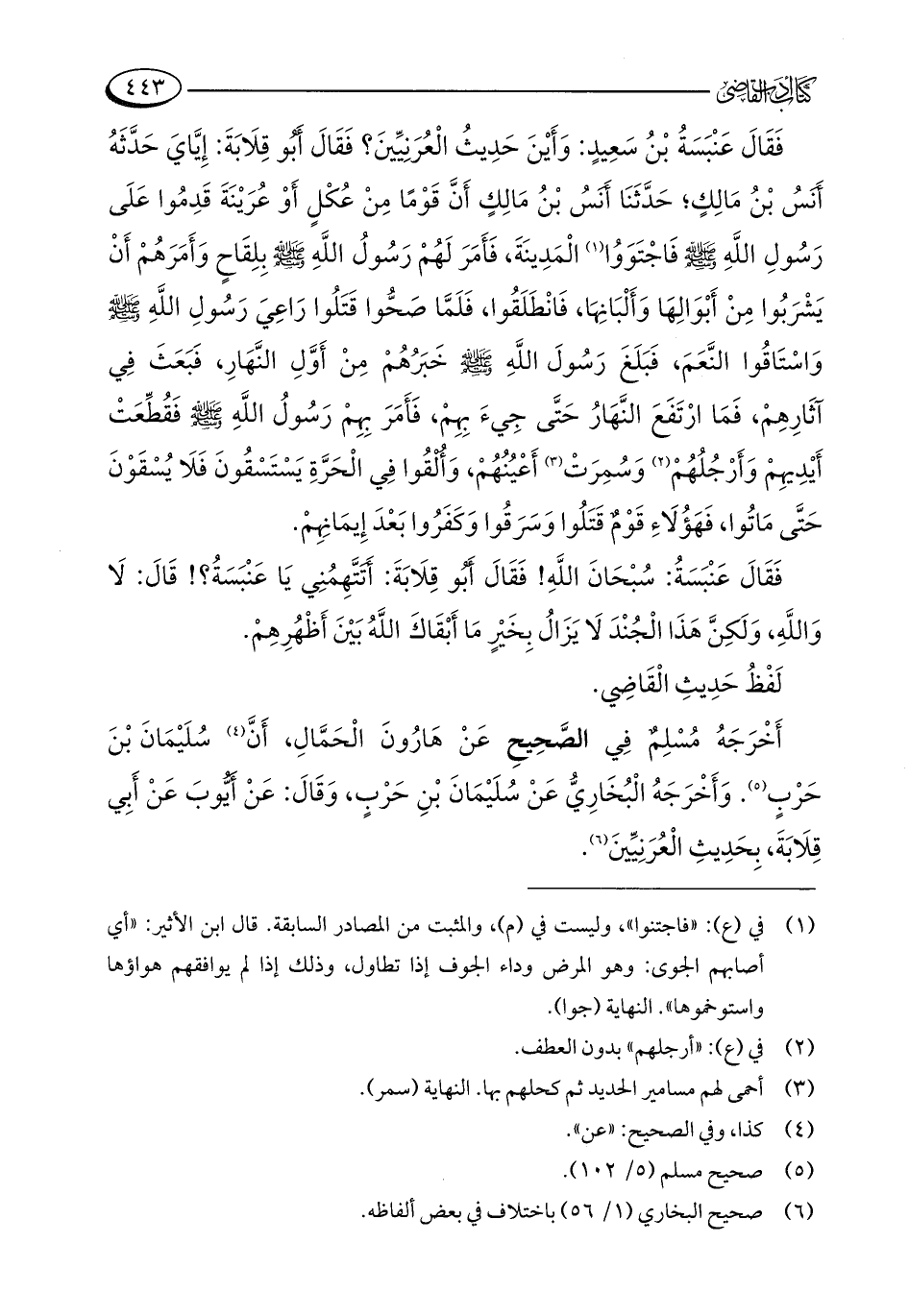 أَخْرَجَهُ مُسْلِمٌ فِي الصَّحِيحِ عَنْ هَارُونَ الْحَمَّالِ، أَنَّ (¬4) سُلَيْمَانَ بْنَ حَرْبٍ (¬5). وَأَخْرَجَهُ الْبُخَارِيُّ عَنْ سُلَيْمَانَ بْنِ حَرْبٍ، وَقَالَ: عَنْ أَيُّوبَ عَنْ أَبِي قِلَابَةَ، بِحَدِيثِ الْعُرَنِيِّينَ (¬6).