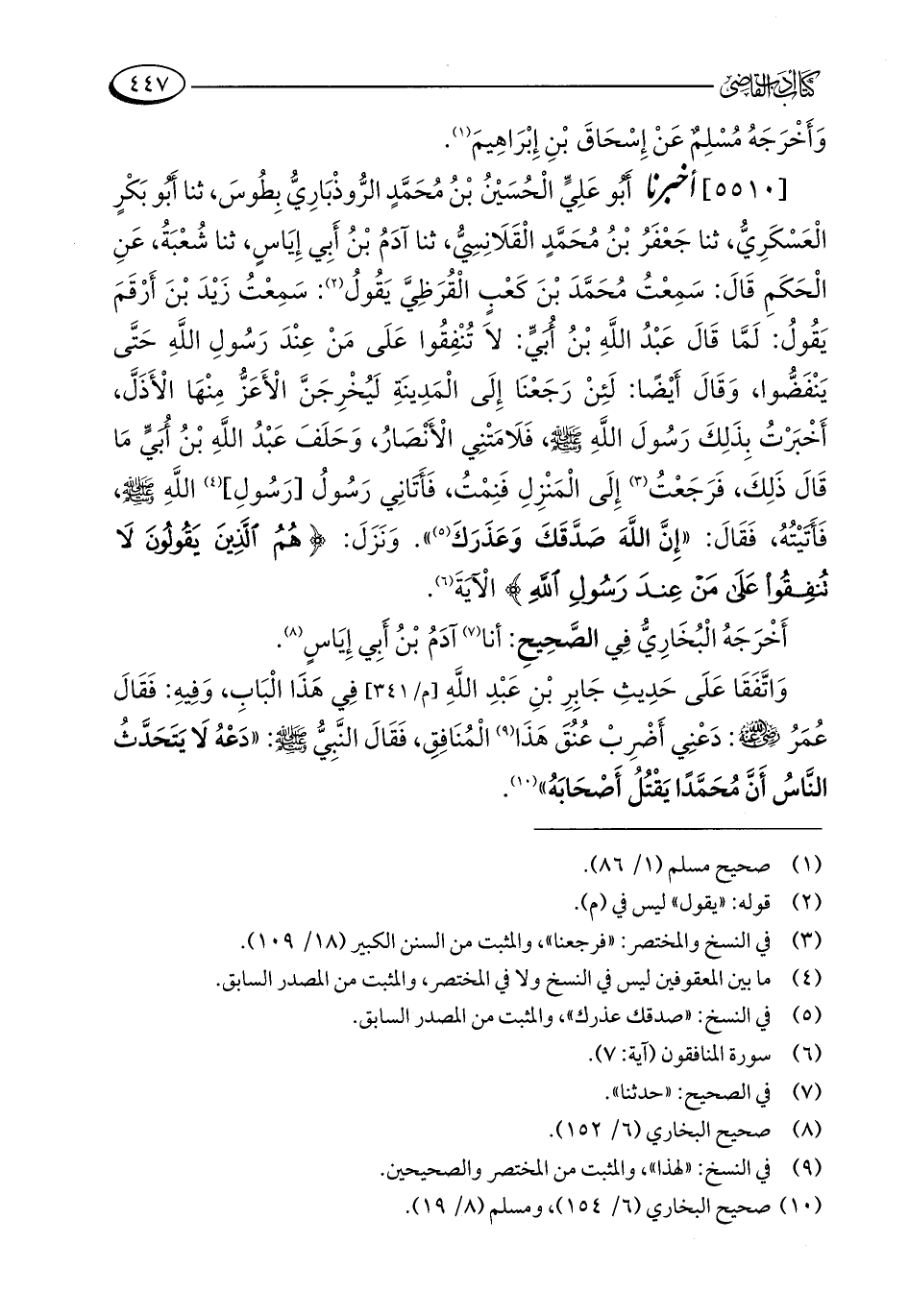 [5510] أخبرنا أَبُو عَلِيٍّ الْحُسَيْنُ بْنُ مُحَمَّدٍ الرُّوذْبَارِيُّ بِطُوسَ، ثنا أَبُو بَكْرٍ الْعَسْكَرِيُّ، ثنا جَعْفَرُ بْنُ مُحَمَّدٍ الْقَلَانِسِيُّ، ثنا آدَمُ بْنُ أَبِي إِيَاسٍ، ثنا شُعْبَةُ، عَنِ الْحَكَمِ قَالَ: سمِعْتُ مُحَمَّدَ بْنَ كَعْبٍ الْقُرَظِيَّ يَقُولُ (¬2): سَمِعْتُ زَيْدَ بْنَ أَرْقَمَ يَقُولُ: لَمَّا قَالَ عَبْدُ اللَّهِ بْنُ أُبَيٍّ: لَا تُنْفِقُوا عَلَى مَنْ عِنْدَ رَسُولِ اللَّهِ حَتَّى يَنْفَضُّوا، وَقَالَ أَيْضًا: لَئِنْ رَجَعْنَا إِلَى الْمَدِينَةِ لَيُخْرِجَنَّ الْأَعَزُّ مِنْهَا الْأَذَلَّ، أَخْبَرْتُ بِذَلِكَ رَسُولَ اللَّهِ - صلى الله عليه وسلم -، فَلَامَتْنِي الْأَنْصَارُ، وَحَلَفَ عَبْدُ اللَّهِ بْنُ أُبَيٍّ مَا قَالَ ذَلِكَ، فَرَجَعْتُ (¬3) إِلَى الْمَنْزِلِ فَنِمْتُ، فَأَتَانِي رَسُولُ [رَسُولِ] (¬4) اللَّهِ - صلى الله عليه وسلم -، فَأَتَيْتُهُ، فَقَالَ: "إِنَّ اللَّهَ صَدَّقَكَ وَعَذَرَكَ (¬5) ". وَنَزَلَ: {هُمُ الَّذِينَ يَقُولُونَ لَا تُنْفِقُوا عَلَى مَنْ عِنْدَ رَسُولِ اللَّهِ} الْآيَةَ (¬6).