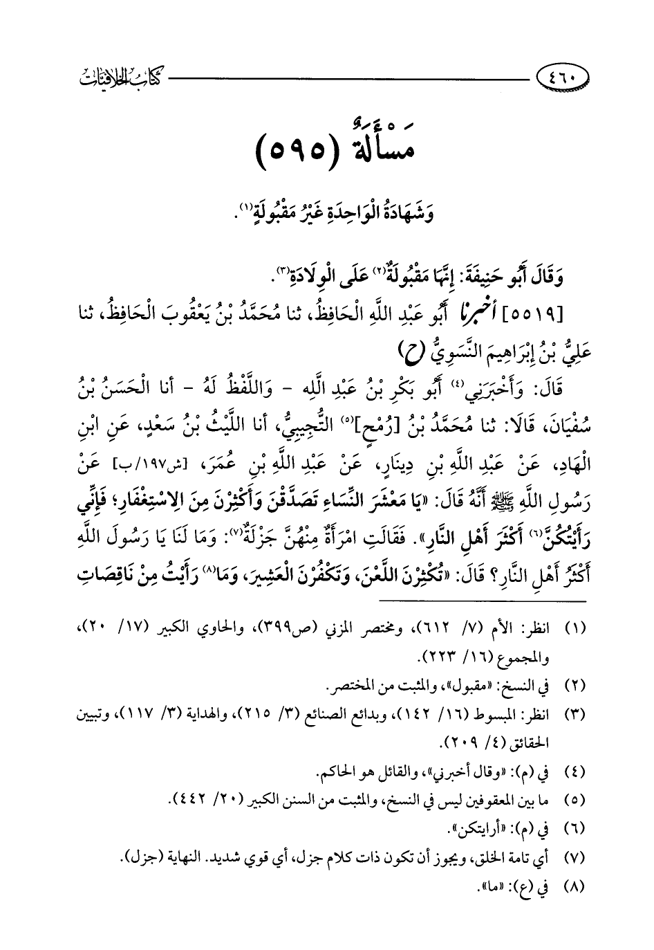 (¬3) انظر: المبسوط (16/ 142)، وبدائع الصنائع (3/ 215)، والهداية (3/ 117)، وتبيين الحقائق (4/ 209).