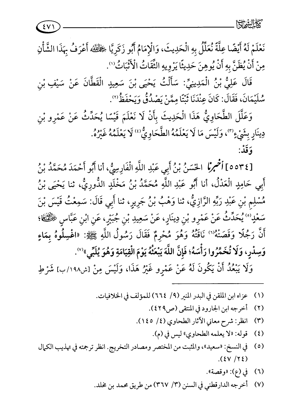 وَعَلَّلَ الطَّحَاوِيُّ هَذَا الْحَدِيثَ بِأَنْ لَا نَعْلَمَ قَيْسًا يُحَدِّثُ عَنْ عَمْرِو بْنِ دِينَارٍ بِشَيْءٍ (¬3)، وَلَيْسَ مَا لَا يَعْلَمُهُ الطَّحَاوِيُّ (¬4) لَا يَعْلَمُهُ غَيْرُهُ.